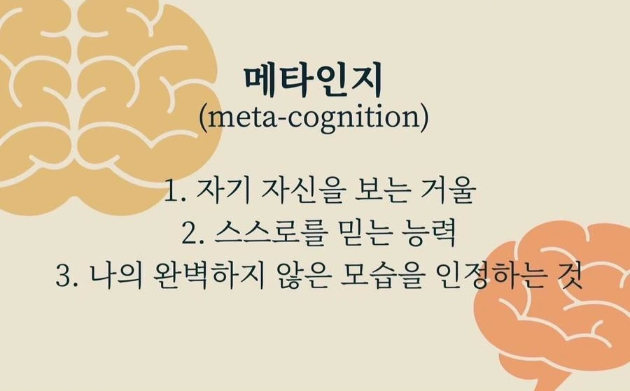 얼마 전, 메타인지라는 개념에 대해 알게 되었다. 메타인지는 쉽게 말해 내가 무엇을 알고 무엇을 모르는지에 대해 아는 것을 말한다. 메타인지 능력이 발달 될수록 자신이 모르는 부분을 보완하기 위한 계획을 내릴 수 있고, 그 계획에 따라 자신의 행동을 스스로 수정할 수 있게 된다고 한다. 이런 장점 탓에 메타인지는 주로 교육 분야에서 많이 이용되고 있는데 나는 메타인지를 교육 분야뿐만 삶의 모든 영역에 적용되어야 한다는 생각이 들었다. 나에게 무엇이 부족한지를 알아야 개선할 수 있고, 나를 힘들게 하는 환경이 무엇인지 알아야 더 나은 곳으로 나아갈 수 있고, 내가 잘 알고 잘 하는 분야가 무엇인지 알아야 그 부분을 성장시킬 수 있기 때문이다.