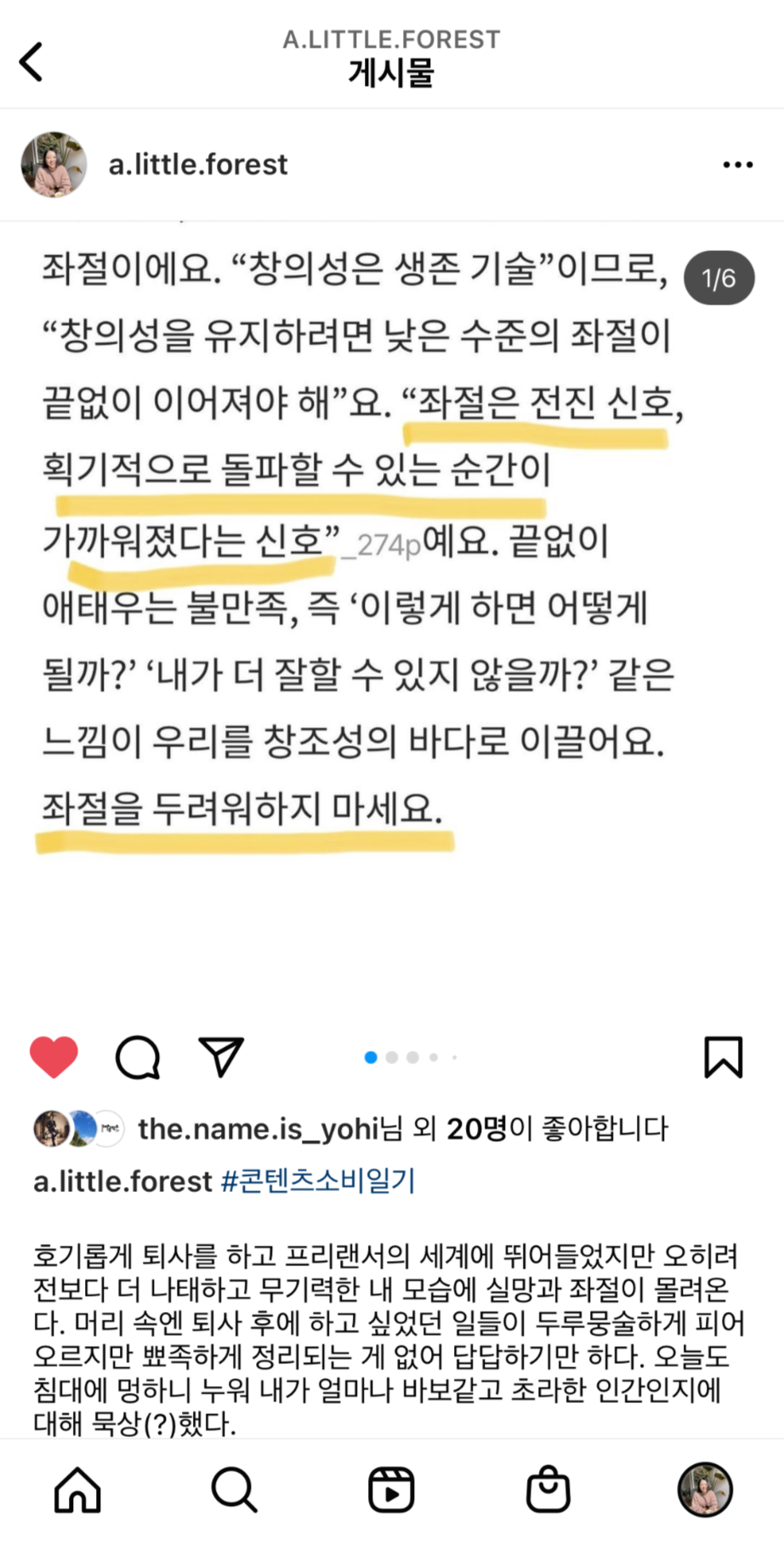 실례로 이미소 대표의 ‘감자밭’ 노트를 읽으며 아버지에 대한 그리움을 느꼈습니다. 이미소 대표의 기업가 정신이 모두 아버지에게서 왔다는 스토리는 오직 롱블랙에서만 알 수 있는 내용이었기 때문이죠. 『멘탈이 무기다』 리뷰 노트에서는 시작에 대한 두려움을 극복하기도 했습니다. “창의성을 유지하려면 낮은 수준의 좌절이 끝없이 이어져야 한다”는 책의 내용 뒤에 ‘좌절을 두려워하지 마세요’라는 에디터의 한 문장이 제 가슴을 울렸기 때문입니다.