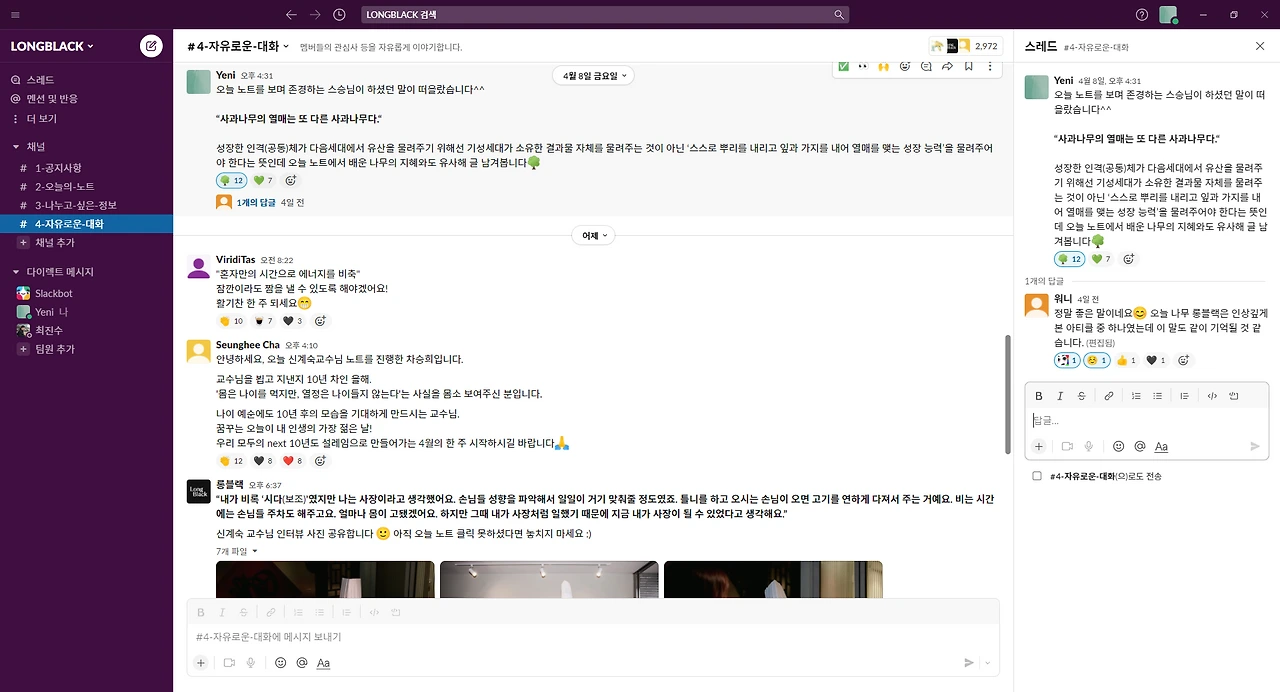 롱블랙의 또 다른 재미는 ‘슬랙(협업 전문 서비스)’으로 운영되는 커뮤니티입니다. 앞서 말했던 글 하단의 ‘질문’을 이곳에서 나눌 수 있습니다. 약 3천 명이 접속해있는 롱블랙 슬랙에는 또 다른 콘텐츠들이 쌓입니다. 콘텐츠를 읽고 보고 즐긴 회원들 간의 활발한 소통이죠. 슬랙에는 회원들의 다양한 리뷰가 쌓입니다. 노트에서 미처 다 보여주지 못한 인터뷰 사진을 보는 재미도 쏠쏠합니다. 때로는 날카로운 피드백도 올라오죠. 롱블랙팀은 이를 적극적으로 수용합니다.
