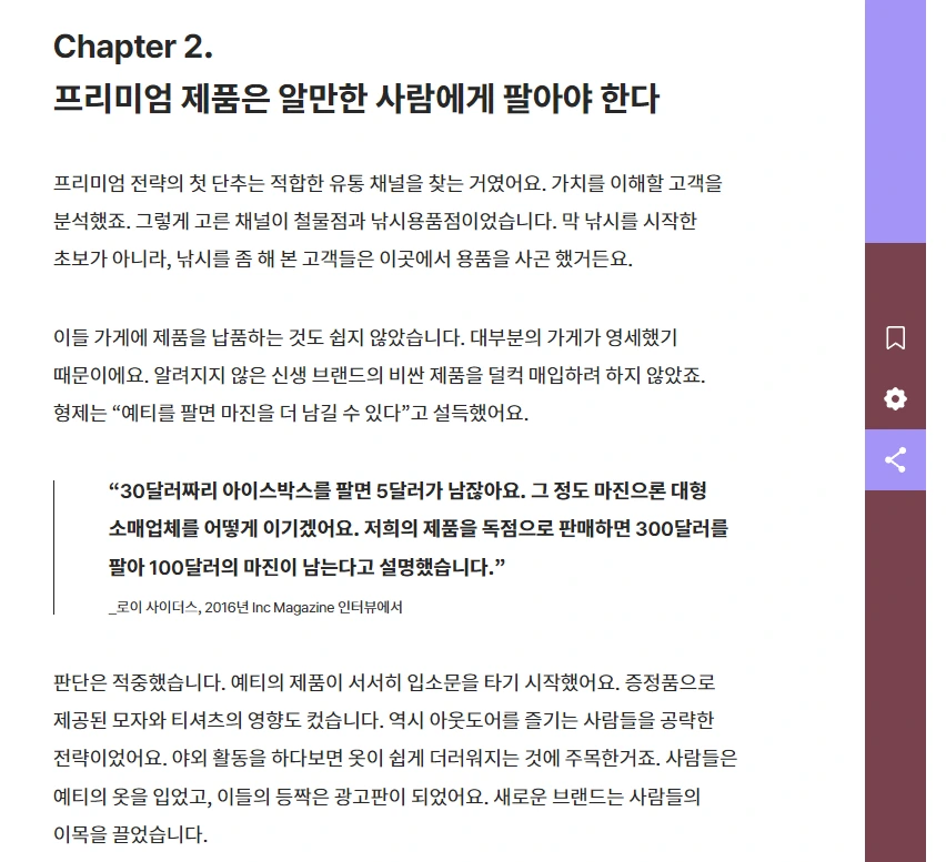 우선 후킹 되는 제목을 클릭하면 롱블랙 프렌즈 L, B, C, K가 오늘의 콘텐츠를 소개합니다. 각 프렌즈를 대표하는 네 가지 색깔까지 있어 특징에 맞는 콘텐츠를 읽는 재미도 있습니다. 본문은 여러 개의 Chapter로 나눠집니다. 주로 브랜드 창업자의 스토리로 시작하죠. 창업자의 어린 시절부터 지금의 브랜드를 창업하게 된 계기, 그 과정에서 일어난 일들과 현재가 차근차근 진행됩니다. 글을 읽다 보면 오른쪽에 보라색 스크롤바가 보입니다. 전체 글을 어느 정도 읽었는지를 보여주는데 이마저도 감각적인 색이 돋보입니다. 콘텐츠는 프렌즈가 요약한 글과 주제에 맞는 질문으로 마무리됩니다. 마지막까지 여운을 주는 포인트죠. 이렇게 모든 콘텐츠를 읽고 나면 긴 글을 다 읽었다는 뿌듯함과 함께 브랜드에 대한 나만의 ‘관점’까지 얻게 됩니다.