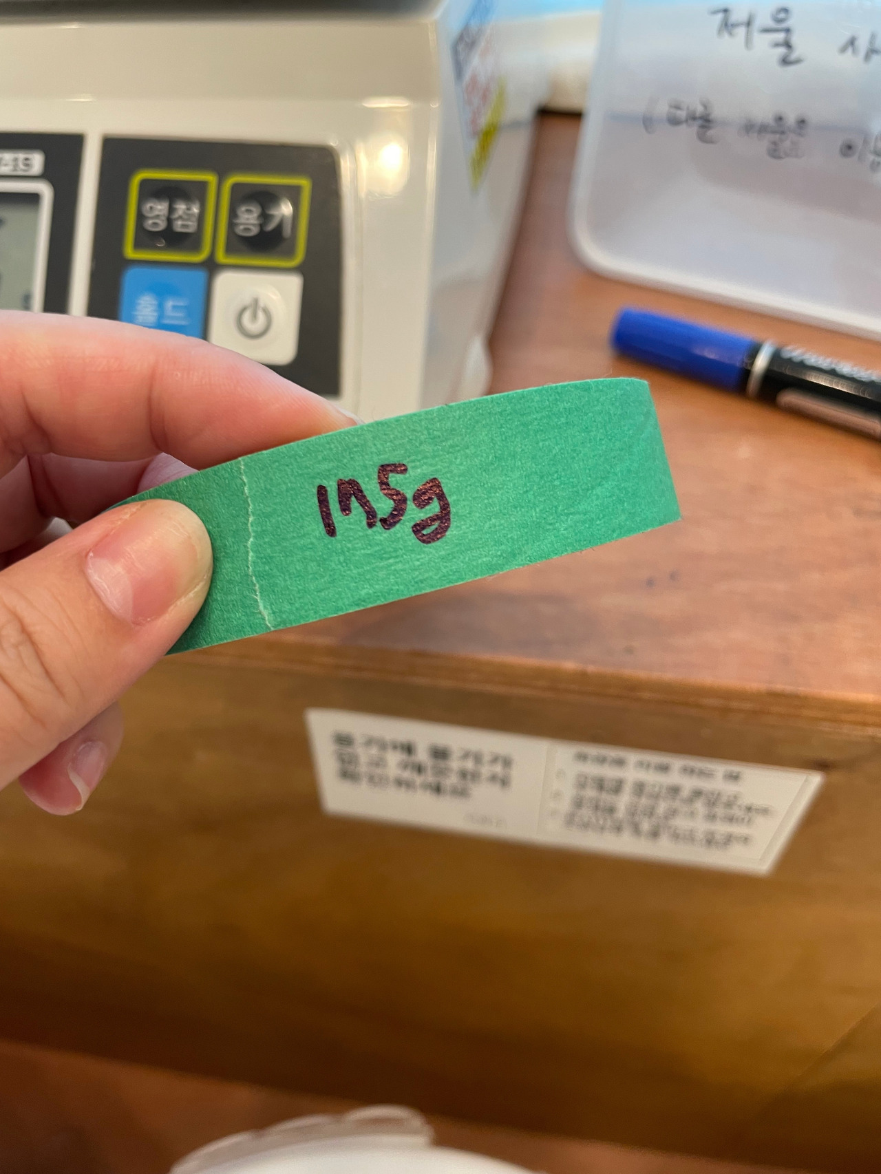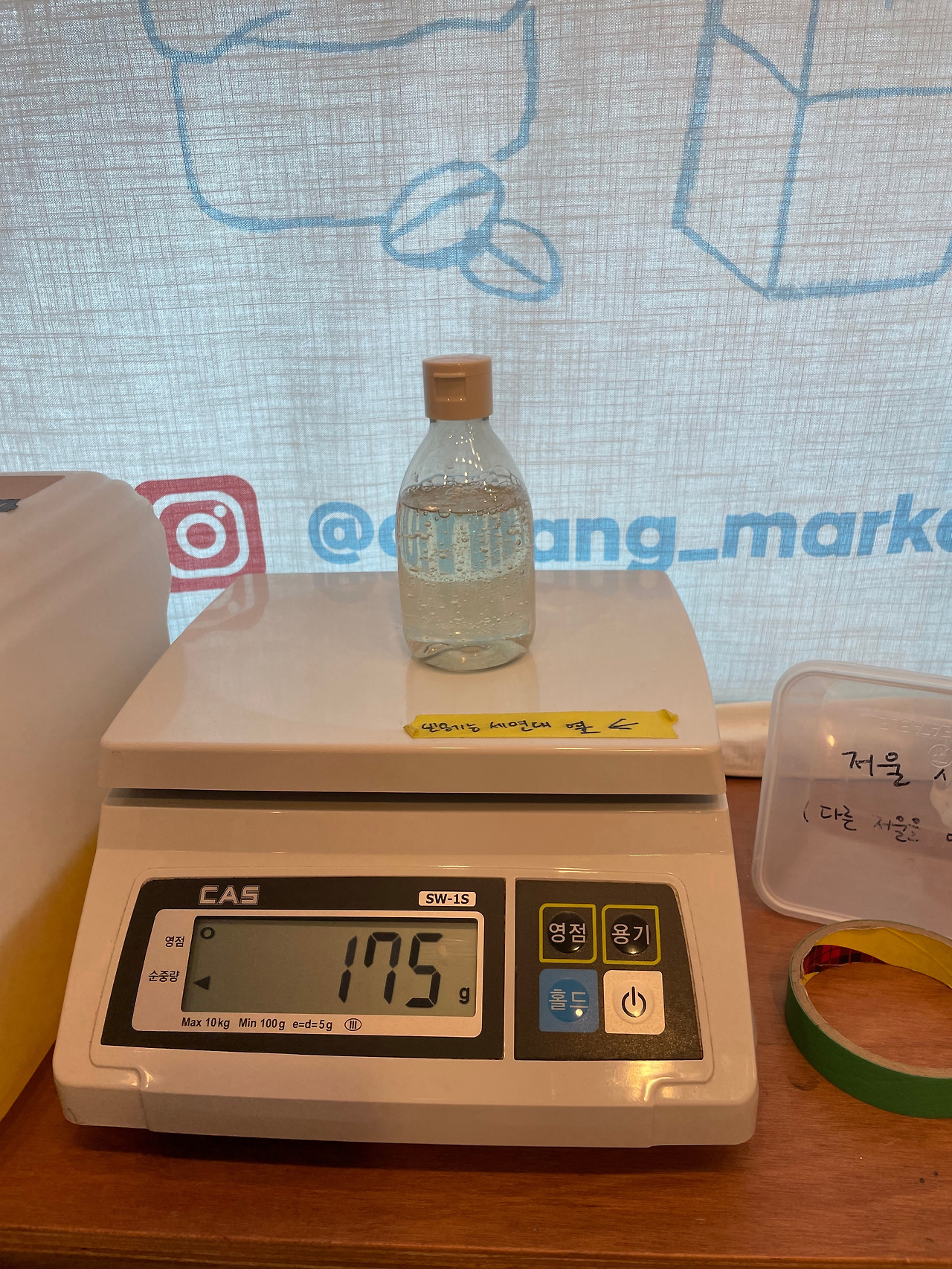 5. 용기에 내용물을 담은 후 저울에 놓고 무게를 잽니다.