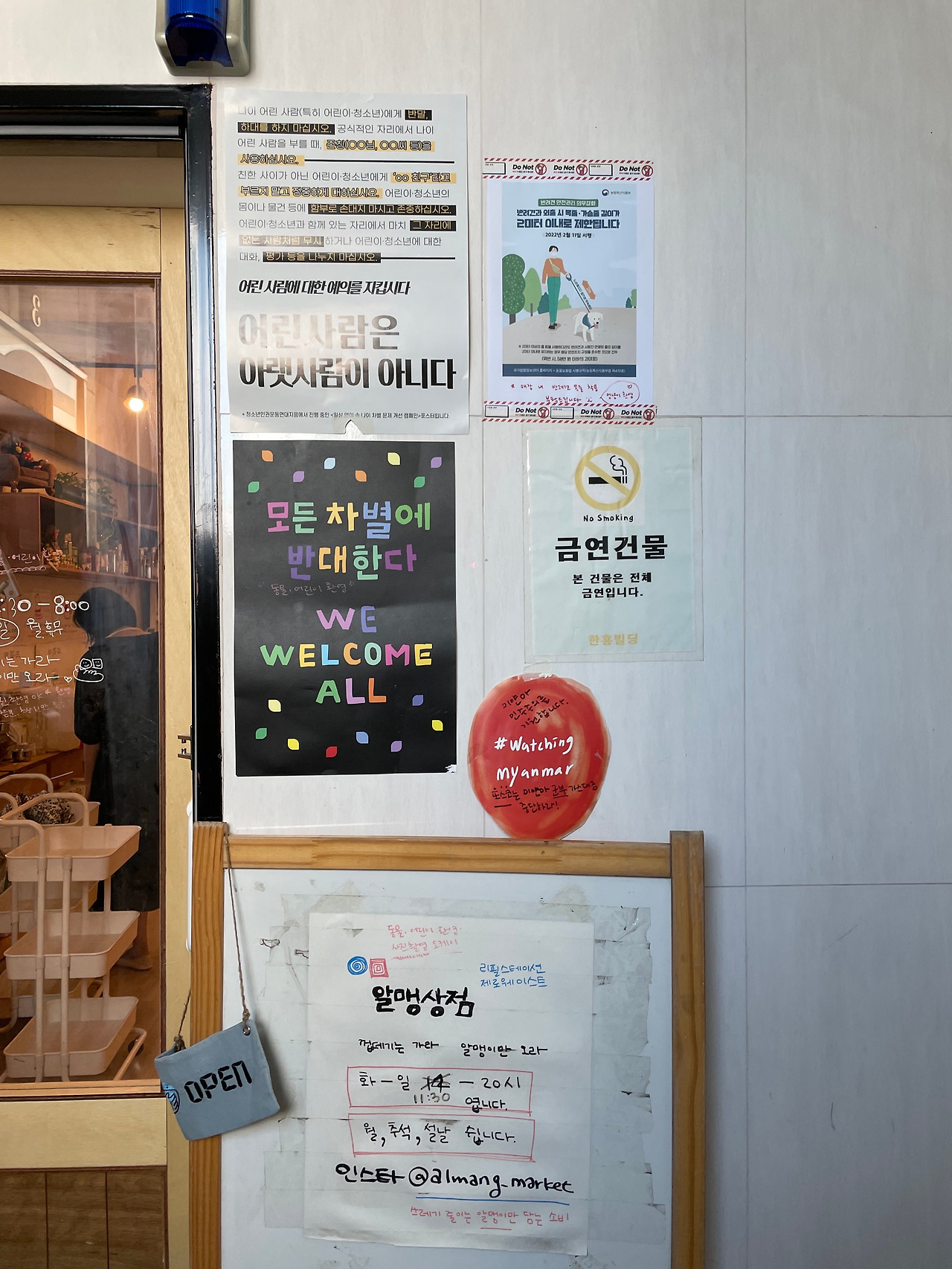 5월 24일 오후, 뜨거운 햇살을 맞으며 망원동에 자리한 알맹상점에 도착했습니다. 가장 먼저 눈에 띄는 것은 계단 슬로프. 3칸밖에 되지 않은 계단이었지만 다소 좁고 가파른 탓에 문턱을 낮추고자 알맹상점에서 설치한 것이었습니다. 교통약자나 유모차, 무거운 짐을 옮기는 택배 기사님들의 불편까지 배려한 계단 슬로프를 보니 알맹상점이 어떤 곳인지 더더욱 궁금했습니다. 그렇게 도착한 알맹상점. 입구에서부터 눈에 띈 것은 '당신의 용기를 환영합니다'라고 적힌 포스터였습니다. 물건을 담는 그릇인 용기(容器)와, 씩씩하고 굳은 기운을 뜻하는 용기(勇氣) 모두를 뜻하는듯한 문구에 센스가 돋보였죠. 문을 열고 들어가 보니 향긋한 비누향이 코를 비집고 들어왔습니다. 색색깔의 비누들은 모두 플라스틱 포장재가 없는 상태였고, 각 비누마다 어떤 특징을 가지고 있는지도 친절하게 안내되어 있습니다.