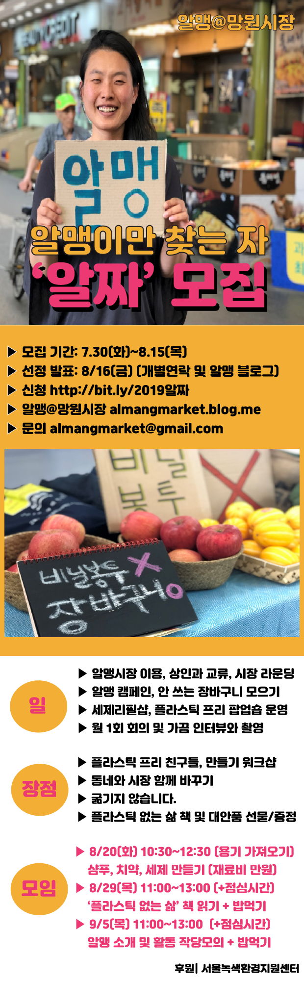알맹상점의 모태가 되는 알맹모임은 이렇게 시작되었습니다. 첫 번째 모임이었던 알짜 1기는 망원시장을 돌아다니며 사장님들에게 비닐봉지 대신 용기와 장바구니 사용을 권하는 활동을 했습니다. 10명 정도의 회원들이 모여서 활동을 했지만, 상인들과 안면을 트며 우리와 같은 '실천러'들이 있다는 사실을 알리는 것에 그쳤죠. 알짜 2기는 망원시장에 좌판을 깔고 자기 용기를 사용한 '알맹러'들에게 무포장 채소를 선물로 주는 캠페인을 열었습니다. 덕분에 망원시장에 제로웨이스트를 실천하는 사람들이 있다는 입소문이 퍼졌죠.