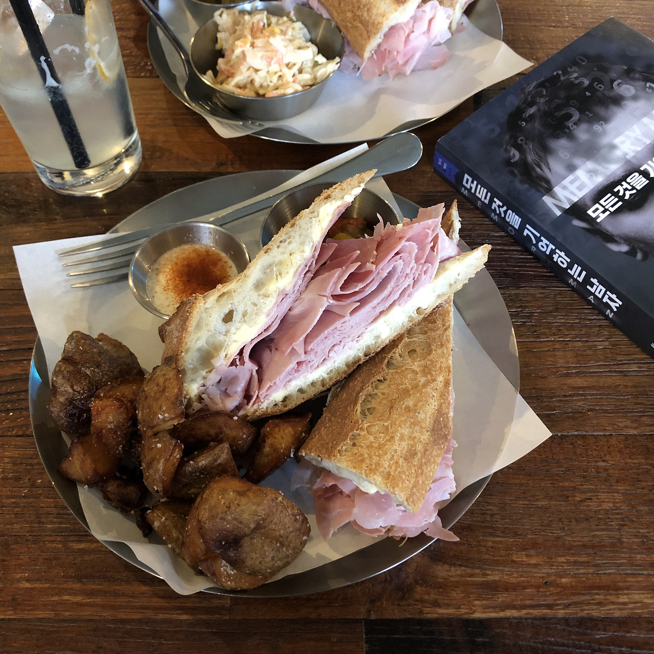 그런데 세수도 안 하고 달려 나갔으니 책을 챙겼을 리가 없다. 그래서 친구의 책을 가방에서 부러 꺼내 달라고 해서 사진을 찍었다. 범죄, 스릴러 장르물을 좋아하는 친구가 요즘 읽고 있는 책이라니 궁금해서 휘리릭 넘겨봤다. 오, 재미있겠는데! 저자가 미국인에 전직 변호사에 정통 스릴러를 쓴다니, 게다가 주인공이 과잉기억 증후군을 앓고 있는 형사라니, 재미없기도 쉽지 않겠는걸. 일단 보관함에 접수. 지난번에 보관함에 담아둔 <콘 비프 샌드위치를 먹는 밤>이라는 책과 함께 주문해야지. 추리소설 애호가인 작가가 추리소설에 나오는 요리에 대한 이야기와 레시피를 담은 책이다. 나는 애거사 크리스티의 <오리엔트 특급 살인> 속 탐정 에르큘 포와로처럼 만족스러운 표정으로 - 콧수염은 없지만 - 아침 식사를 마쳤다.