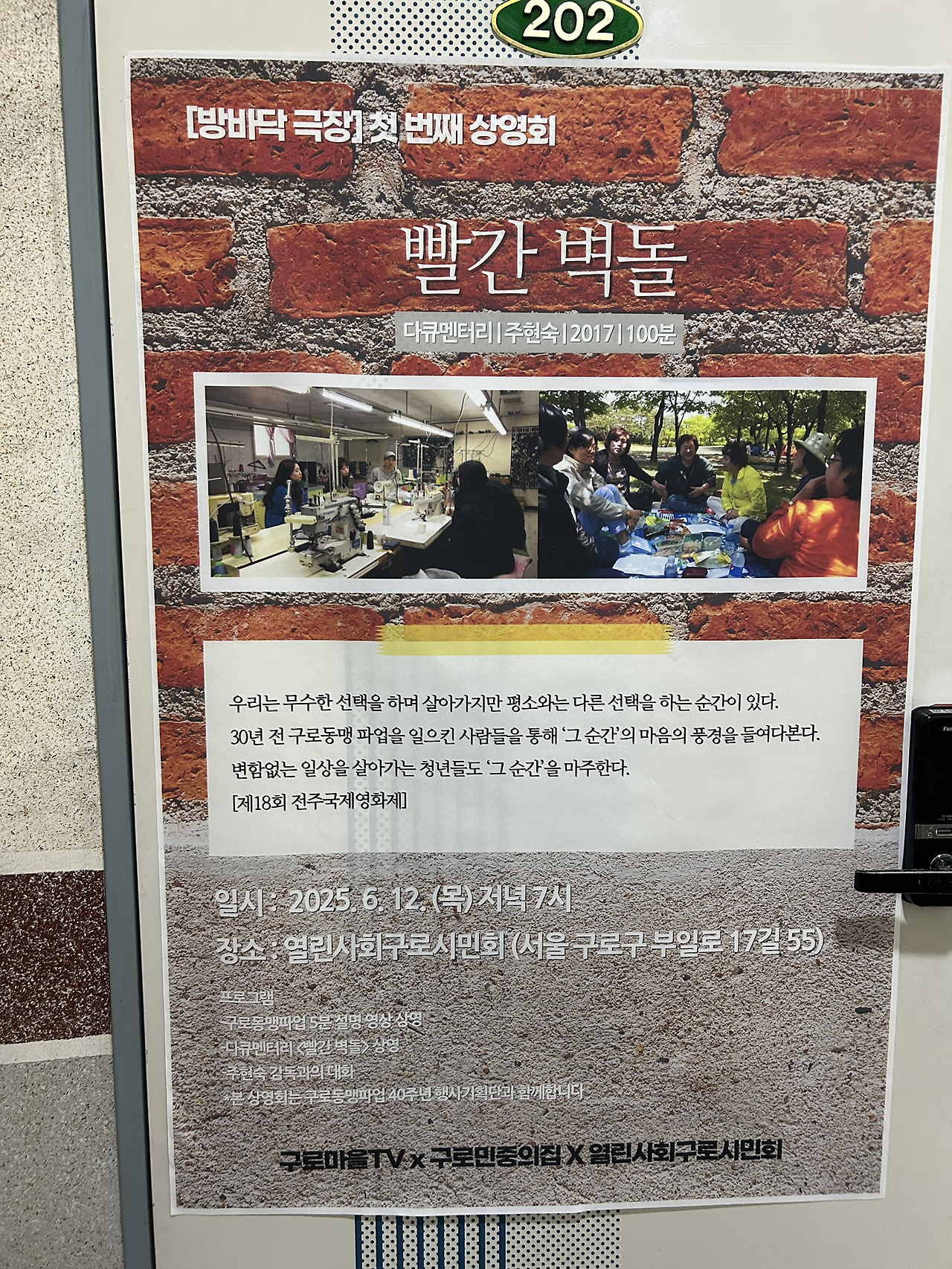 구로동맹파업을 해내고, 또 그 이후 어려운 시간을 겪어온 선배들의 기억과 마음을 읽어주는 다큐였다. 직접 찾아오신 감독님은 “사실이 아니라 이 사람들의 마음을 담고 싶다”고 했다. 그리고 40년전 노동 문제가 지금은 어떻게 이어지고 있는지 질문을 던지기도 한다.