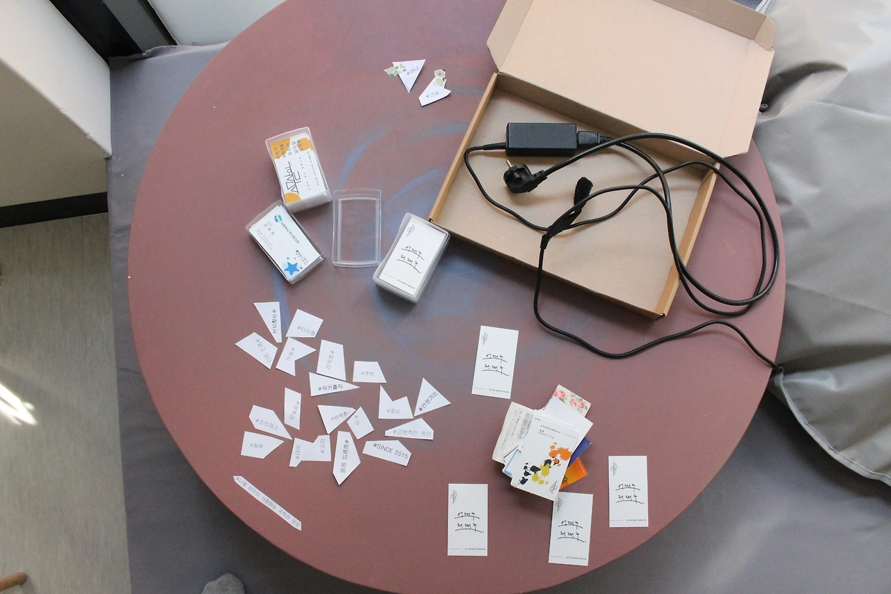 그다음으로 많은 것이 명함이다. 여러 사람을 만나고 다니면서 서로가 건네는 명함들이 가방 곳곳에 흩어져 있었다. 가끔씩 커피 쿠폰도 발견했다. 찍힌 도장은 역시 두 개를 넘지 않는다. 또 가장 많이 굴러다니는 명함은 혜영 본인의 것이다. 개인 명함 종류만도 3개나 된다..