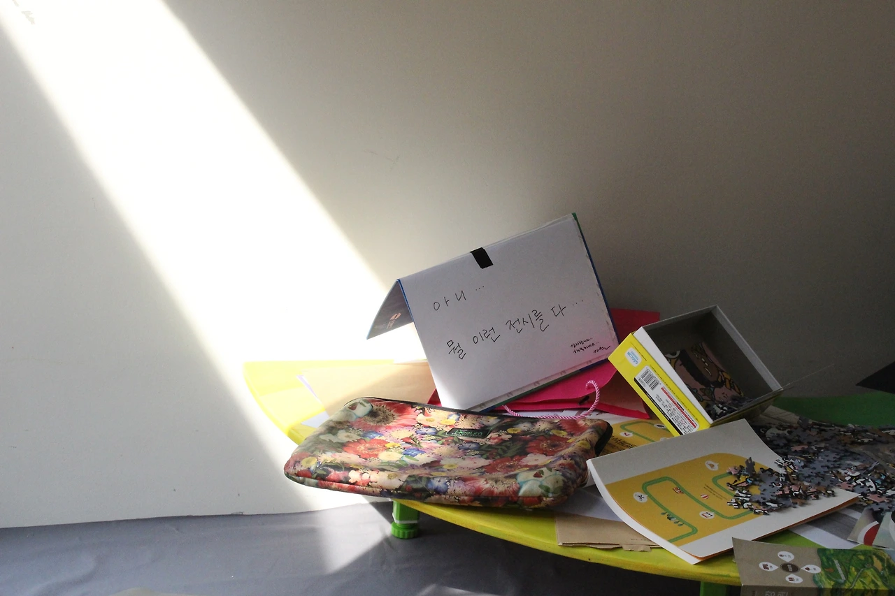 철 지난 계획서, 며칠 지난 주스, 쌓이고 쌓인 명함들, 무수히 많은 메모들. 누군가는 쉽게 버리는 것들은 혜영의 어깨 위에서 존재감을 꾸준히 어필하고 있다.