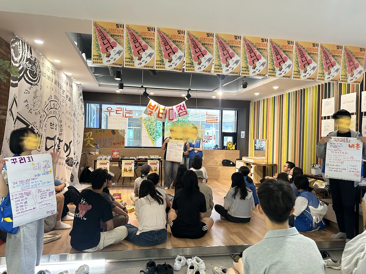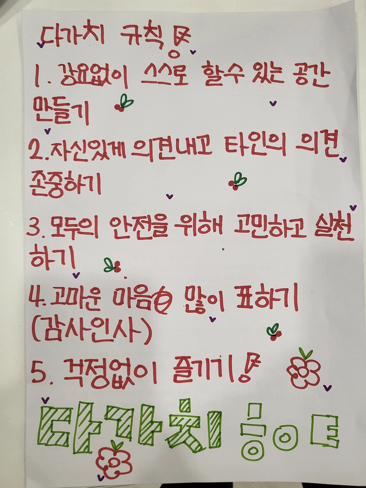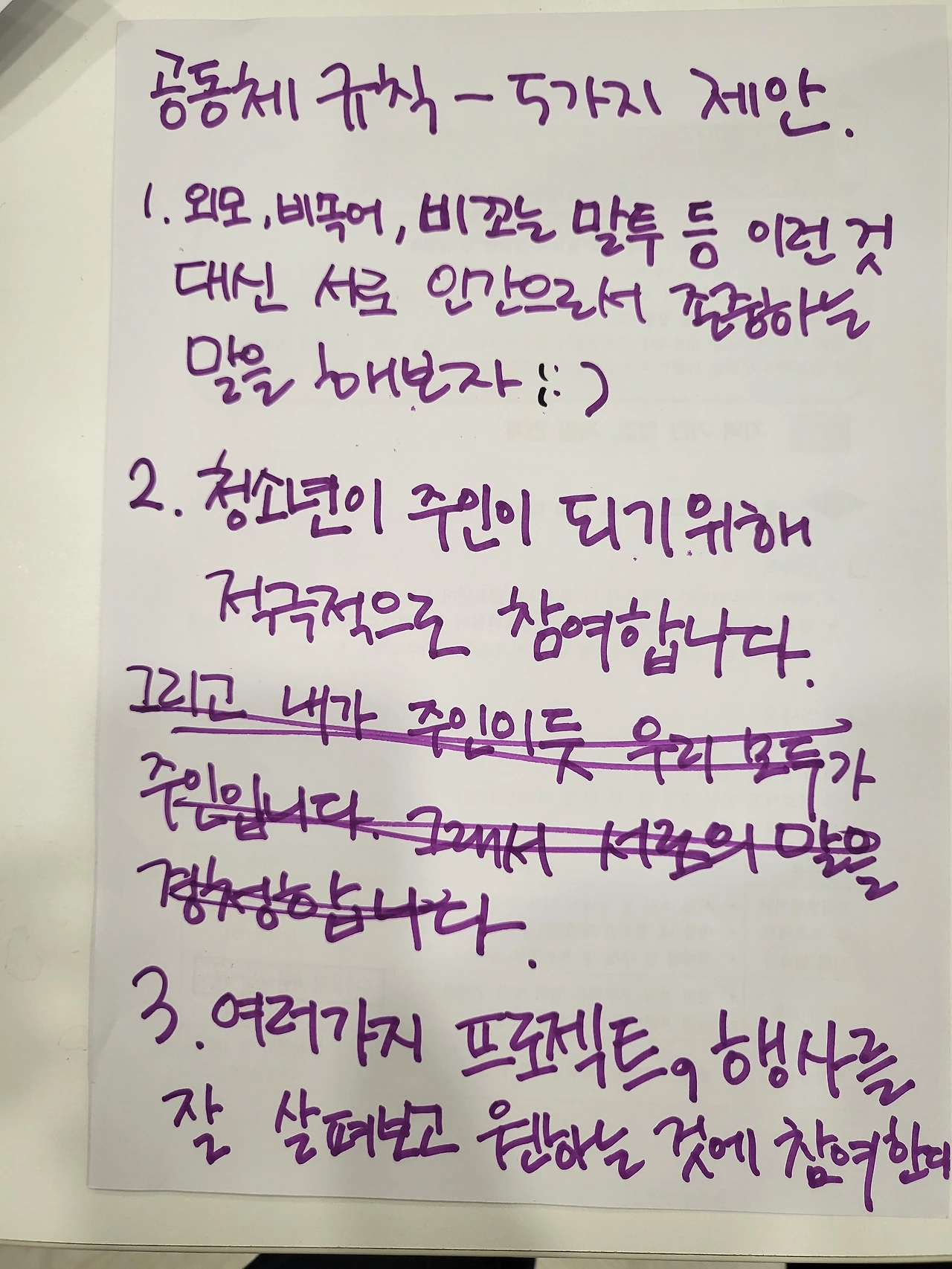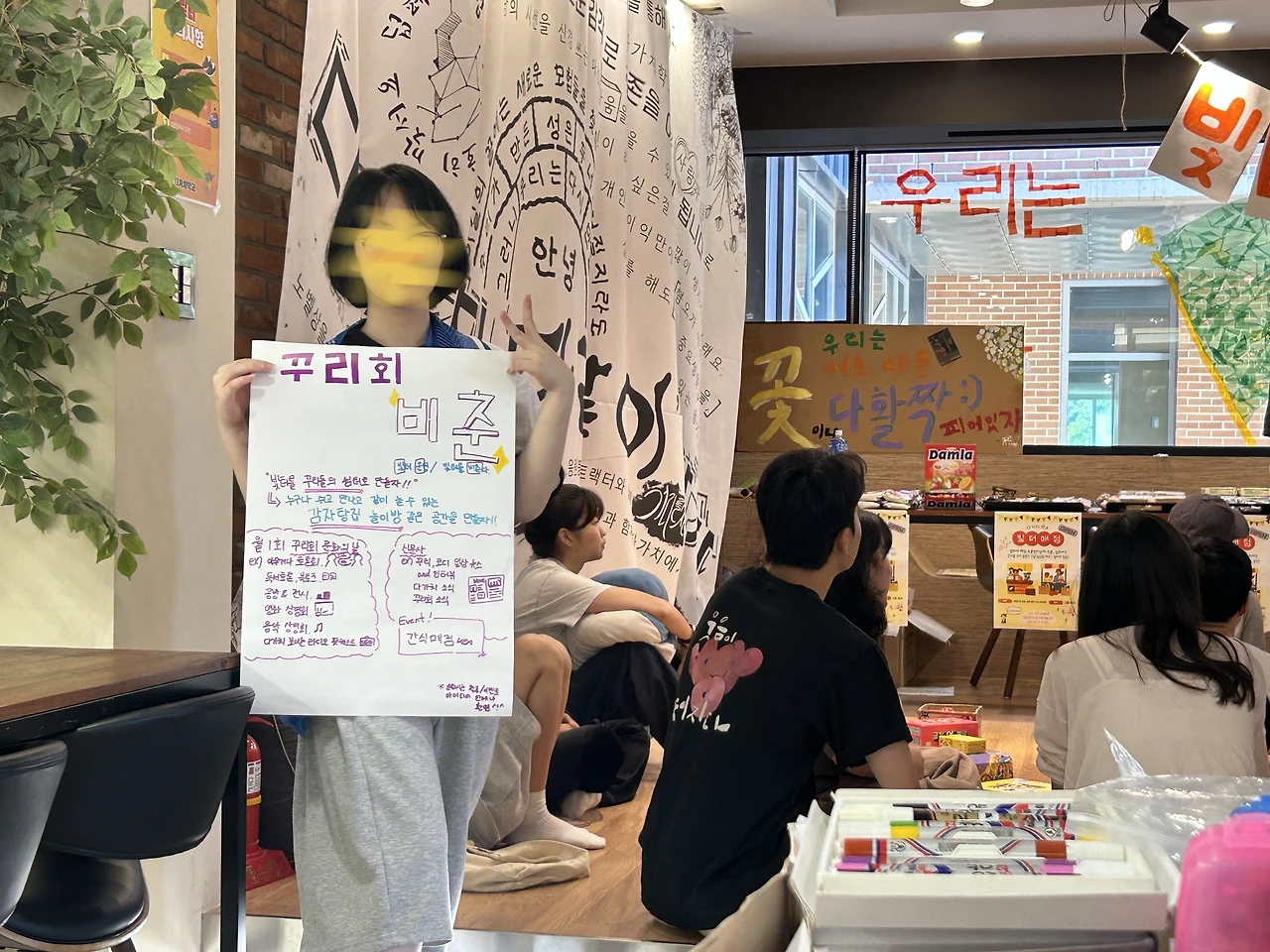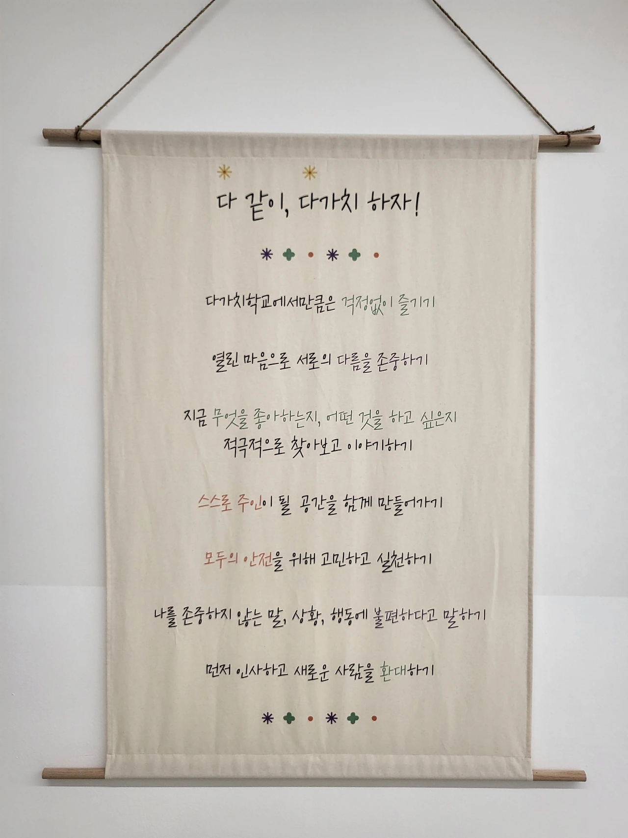체계적이고 효율적인 구조가 조직, 공동체를 오래도록 유지하는 방법이라는 것을 부정할 수는 없다. 하지만 유지하는 것을 넘어 그 조직과 공동체를 살아있게 만들기 위해서, 제대로 자치하는 곳이 되기 위해서는 공동체를 대하는 구성원들의 진심 어린 애정과 신뢰가 있어야 한다. 다가치학교는 학습자의 애정이 움틀 때, 조금 더 깊은 활동에 대해 호기심이 생길 때를 놓치지 않기 위해 촉각을 곤두세운다. 매년 프로젝트 활동이 시작되면 참여하고 있는 학습자들을 다가치학교의 문화를 만드는 청소년 자치회, 〈꾸리회〉로 초대한다. 인원수 제한이 없어서 프로젝트 활동에 참여하고 있다면 언제든 〈꾸리회〉에 들어올 수 있다. 공동체 깊숙하게 들어온 청소년은 공간을 가꾸고 직접 이벤트와 프로그램을 기획해서 연다. 모든 구성원이 다가치학교만의 ‘우리다움’을 만들어가기 위한 규칙도 세운다. 모든 구성원이 이 아지트에 애정을 키워갈 수 있는 계기를 만든다.