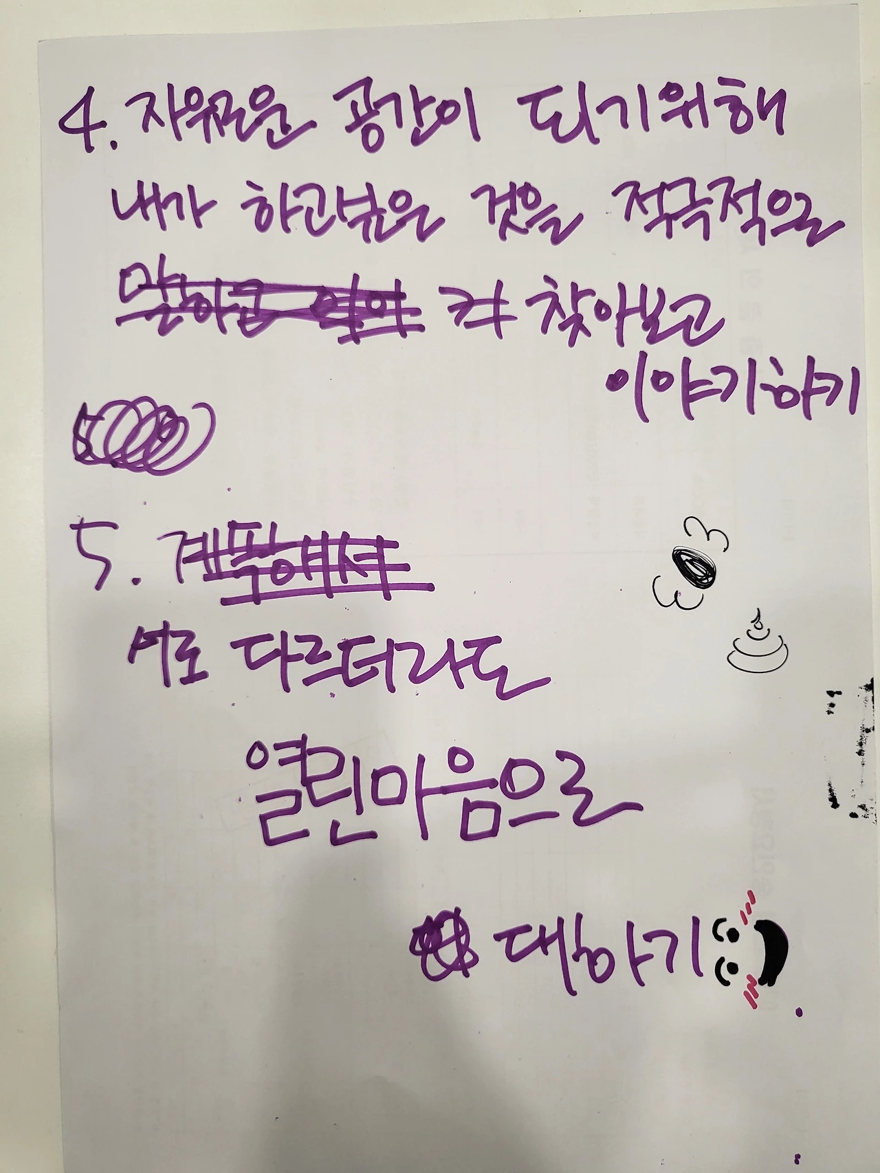 자치 활동에서 지향해야 하는 공동체의 형상은 포용적인 소속감이다. 포용적인 소속감은 다양한 정체성을 가진 구성원들이 어울릴 수 있는 문화를 의미하며, 그 문화는 구성원들이 스스로 책임을 지고 유지해야 한다. 따라서 자치활동은 일률적인 형태를 가진 의사결정 조직이 아니라 유연하게 변화하고 역동적으로 활동하는 공동체에서 가능하다. 하나의 프로젝트팀부터 전체 배움터 구성원을 아우르는 집단에서 일어나는 모든 역동적인 자치활동을 나는 우리다움을 찾아가는 과정이라 부른다. 그리고 우리다움을 좇는 학습자 개개인은 그 과정에서 진짜 나다움을 발견할 수 있으리라.