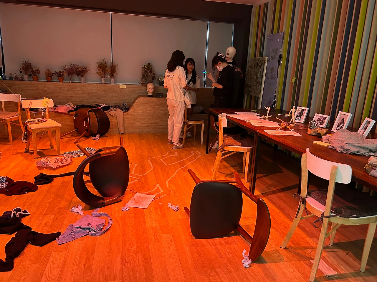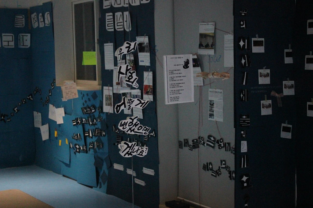 사람들을 공간에 초대하여 즐거운 이벤트와 경험을 선사한 !!공간살려!! 프로젝트는 크리스마스를 맞이하여 2층의 넓은 공간에 사람들이 머무를 수 있도록 간단한 인테리어 작업에 돌입했다. 박스를 오리고 붙여서 가짜(?) 벽난로를 만들어 푸근하고 따뜻한 느낌이 나는 공간을 조성했다. 그리고 마지막 축제에서 그들은 한 면이 거울로 된 연습실을 전시장으로 바꿔냈다. 전시 주제는 ‘다가치학교가 모두를 위한 공간이 되기’였다. 다가치학교 시설은 휠체어 이용자, 시청각 장애인, 성소수자 등 사회에서 소외된 존재가 방문하기에 문턱이 있는 곳이었다. 그 지점들을 하나하나 찾아내고, 대안을 제시했다. 그리고 모두를 위한 공간을 지향하는 !!공간살려!! 팀의 가치와 메시지가 가득 담긴 전시장이었다. 그곳에서 사람들은 한참을 머무르며 평등한 공간, 문턱이 없는 아지트를 함께 고민했다.