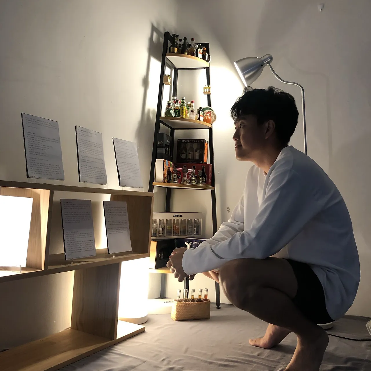 전시장을 세팅하는 바라는 보면 자신의 방안에 놓인 그대로를 재현하고자 기억을 더듬는다. 집에 있는 찬장과 그의 수집품들을 DP하는 모습은 마치 장인이다. 신중에 신중을 더하는 장인이었고, 섬세한 아키비스트였다. 이전 전시자들은 전시장 구성에는 크게 관여하지 않았지만 그는 본인이 편하게 느끼는 그대로를 재현하고자 했다. 자신이 가장 편안한 상태로 감상하는 그 상태 그대로.