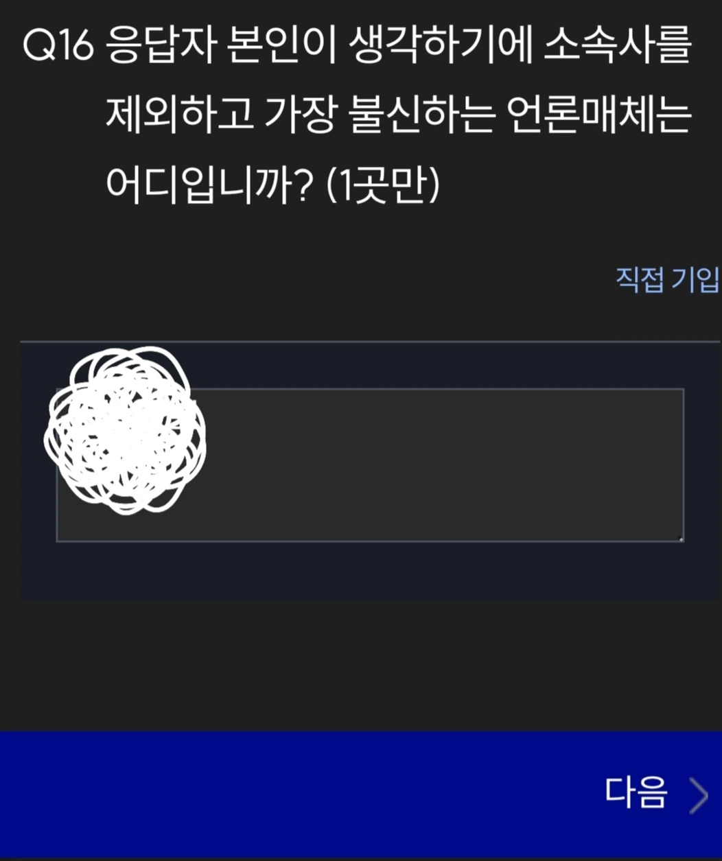 그러다가 기자협회에서 온 설문조사 문자를 받았다. 본인의 언론사를 제외하고 가장 신뢰하는/불신하는 매체를 하나씩 적어야 하는 문항이 있었다.