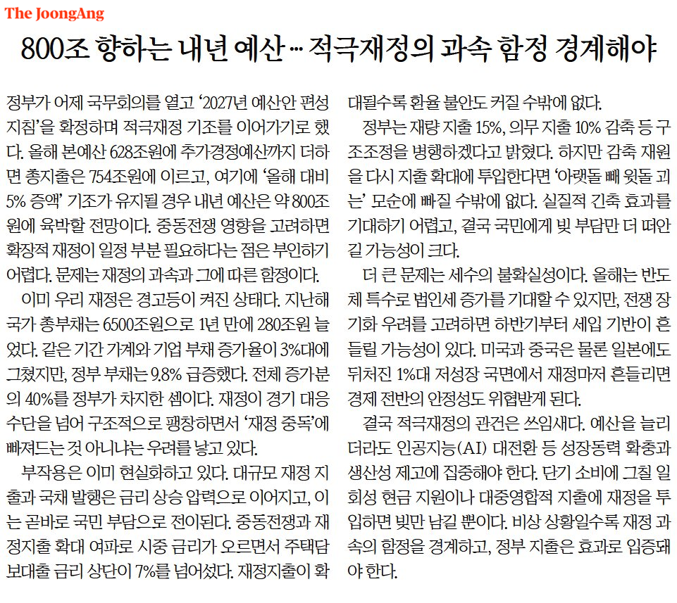 정부가 어제 국무회의를 열고 ‘2027년 예산안 편성 지침’을 확정하며 적극재정 기조를 이어가기로 했다. 올해 본예산 628조원에 추가경정예산까지 더하면 총지출은 754조원에 이르고, 여기에 ‘올해 대비 5% 증액’ 기조가 유지될 경우 내년 예산은 약 800조원에 육박할 전망이다.