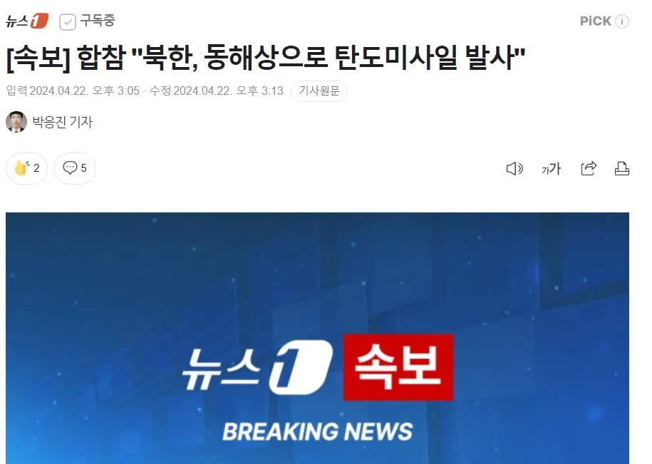 20240422 15시 5분 (뉴스1 發) [속보] 합참 "북한, 동해상으로 탄도미사일 발사"
