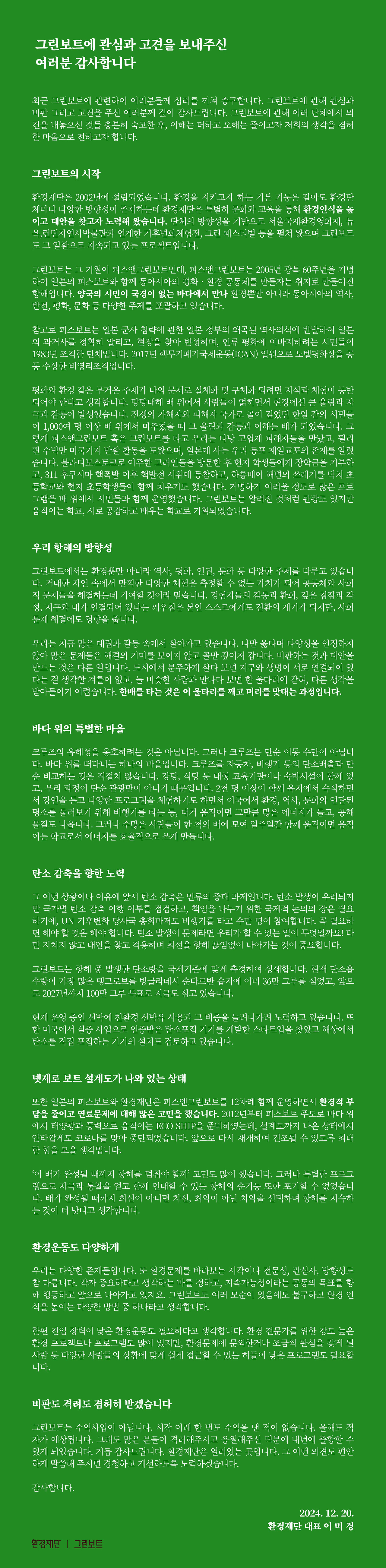 저는 2025년 1월 16일(목)부터 23일(목)까지 환경재단이 주최하는 그린보트를 타고 여행을 떠납니다.