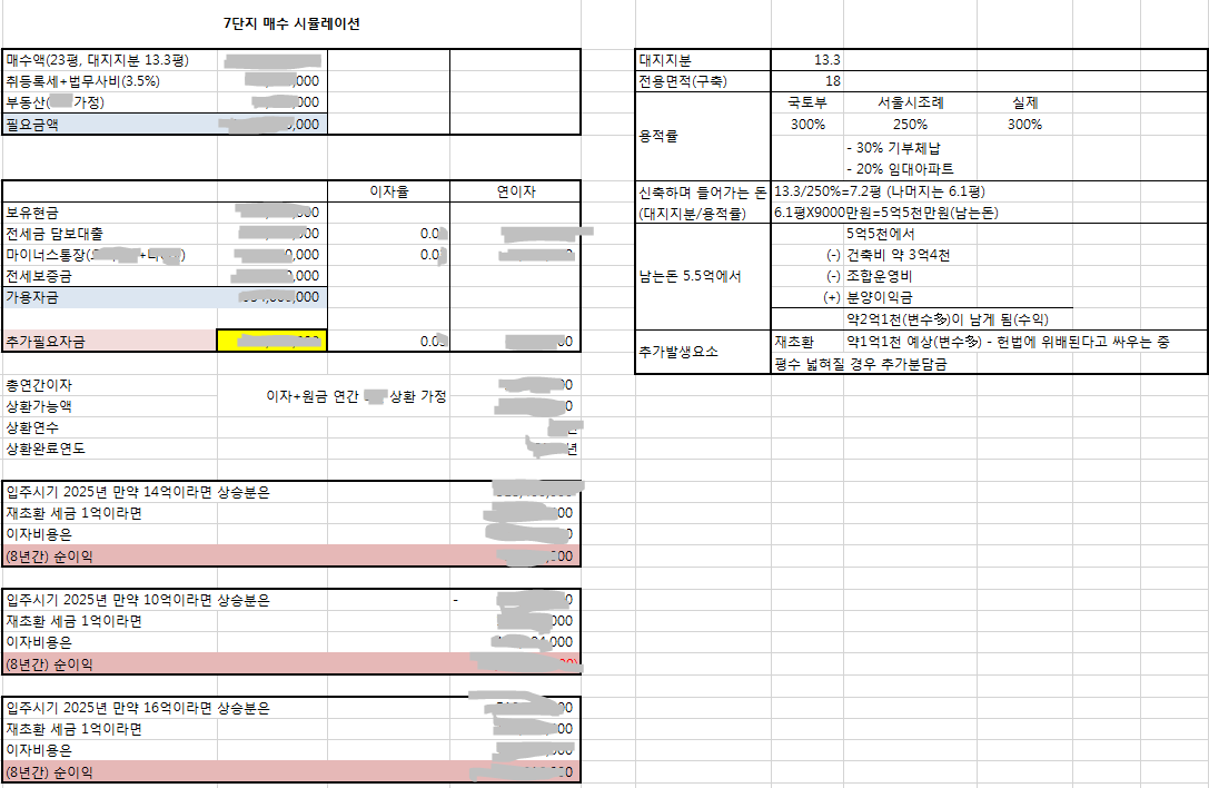 MS 워드와 친한 수진은 오랜만에 MS 엑셀을 켰다. 한결을 설득하기 위해 시뮬레이션을 해보기 위해서다. 매수금액을 넣으면 비용과 수익이 대략적으로나마 계산되도록 수식을 넣어봤다. 어설프게나마 부동산 커뮤니티와 공인중개사들에게 들어 공부한 재건축 관련 정보도 넣어가며 예측해 봤다. 보유기간 동안 내야 할 이자비용도 반영했다.