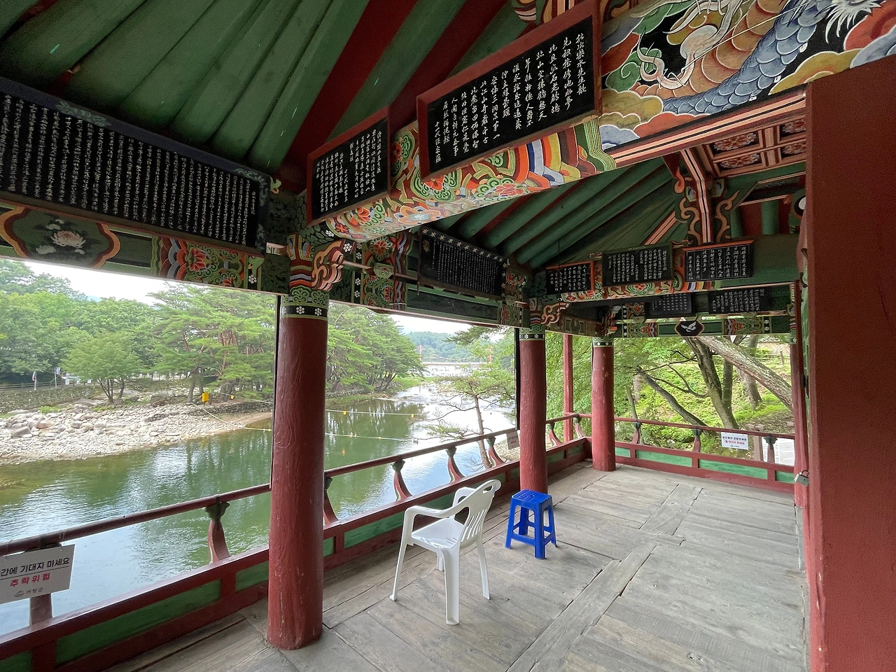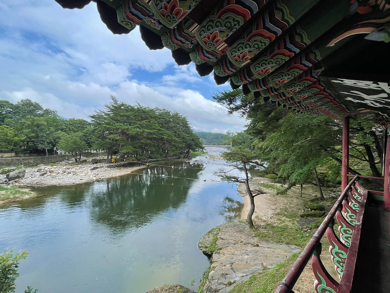 수승대 건너편 솔숲에 부속건물 없이 홀로 세워진 중층의 정자.