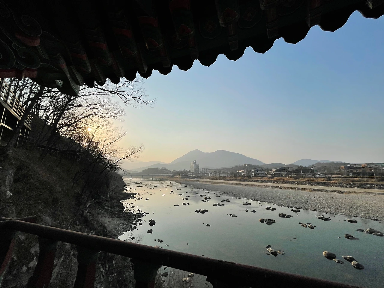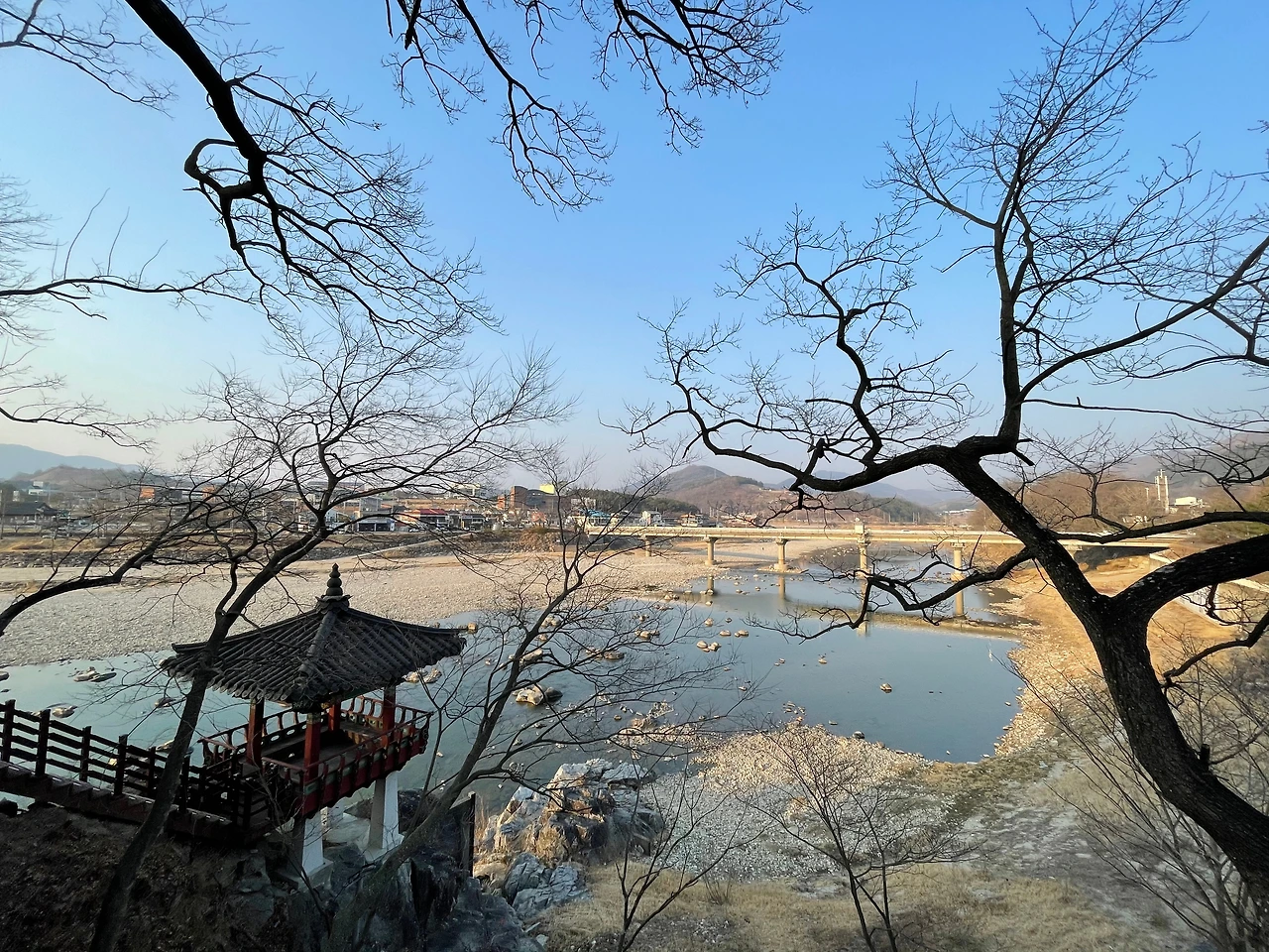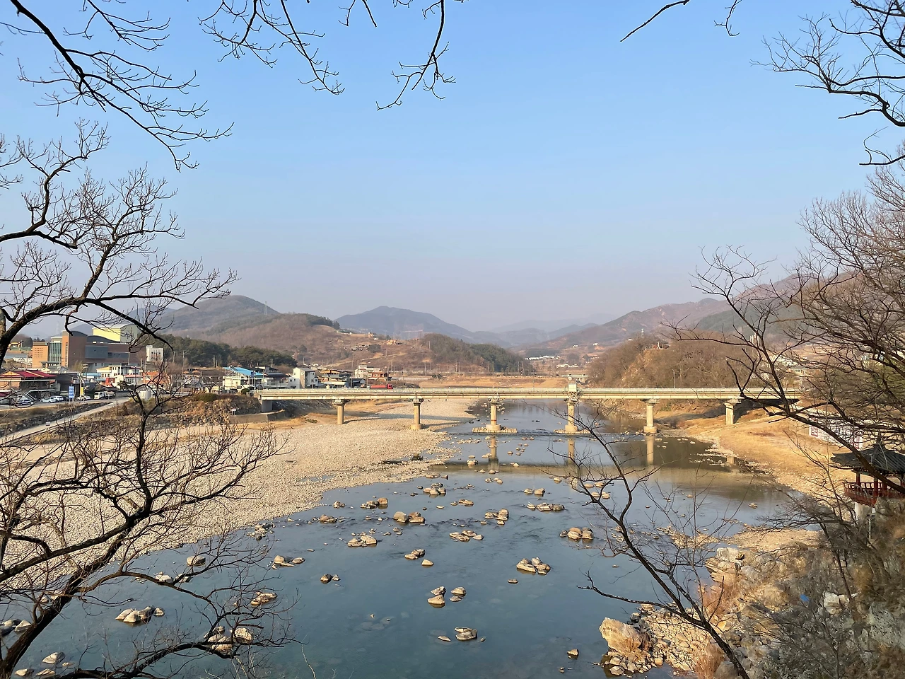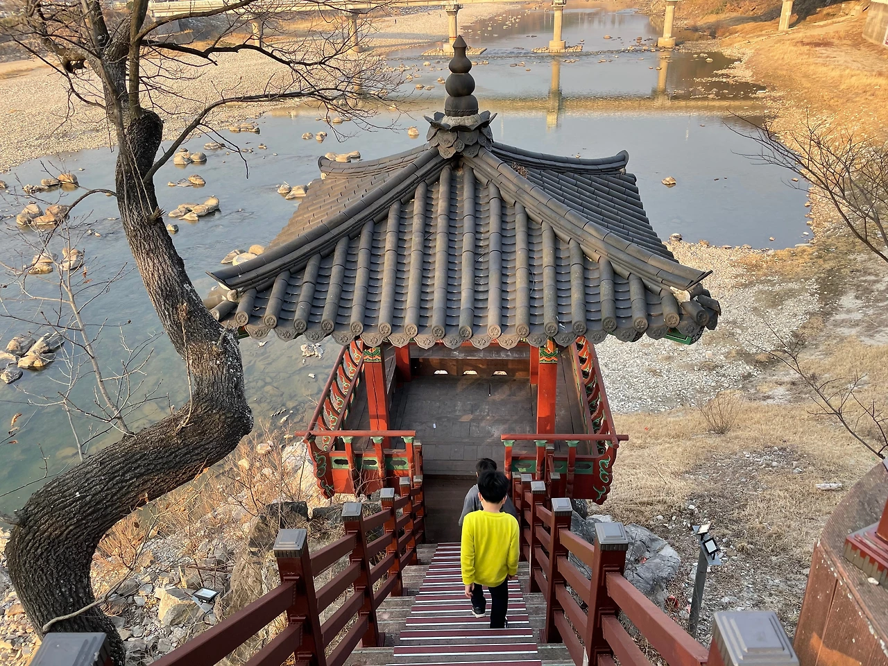 군청 뒷산 절벽에 조성된 항노화산들길에 정자까지 갖춘 강.