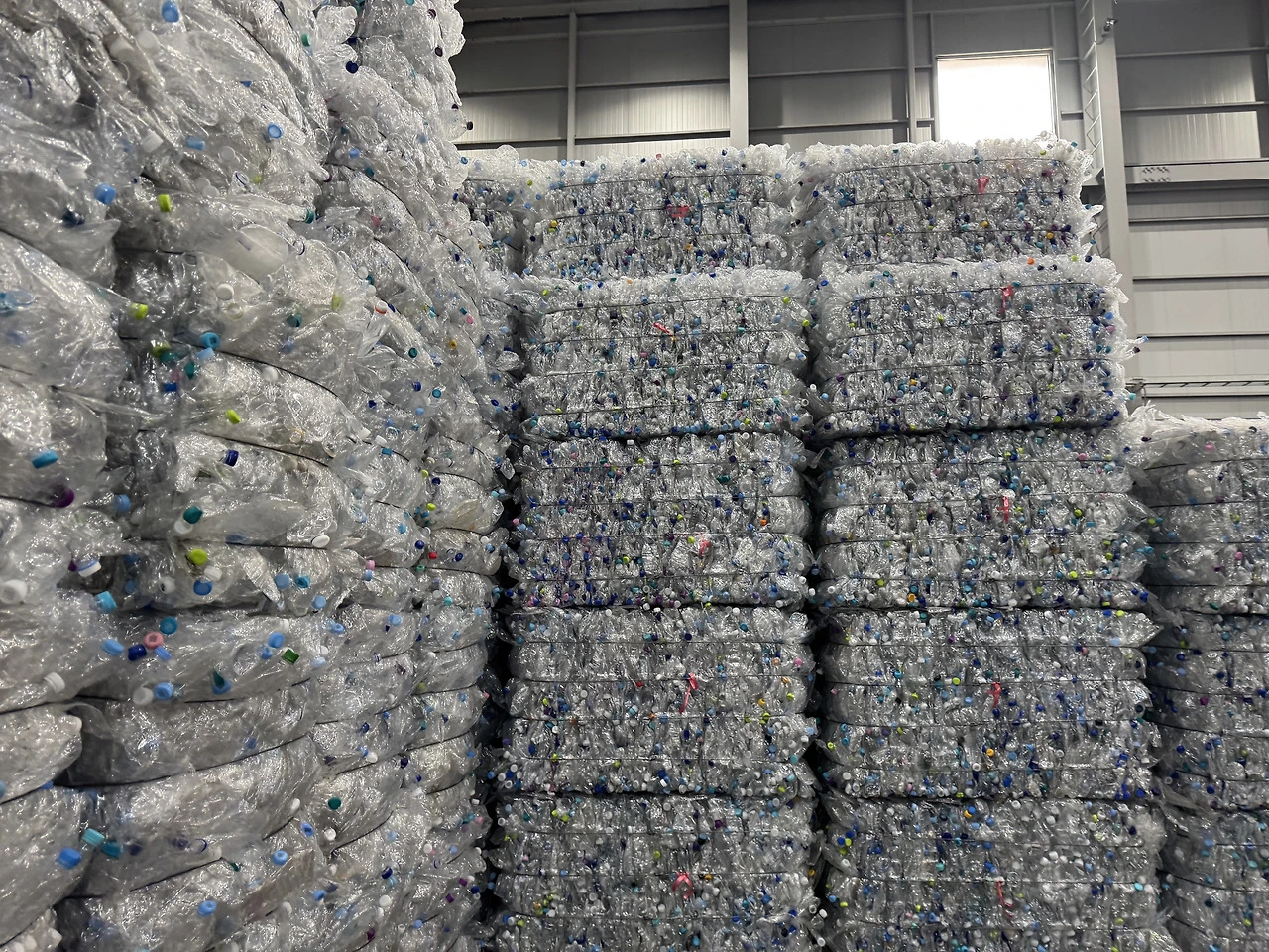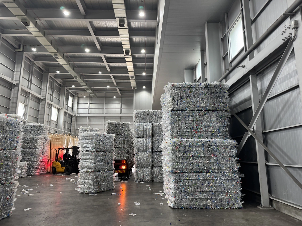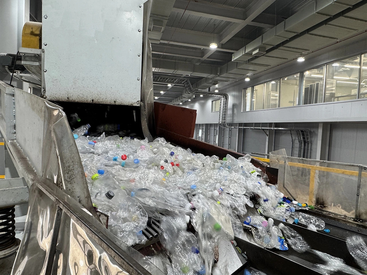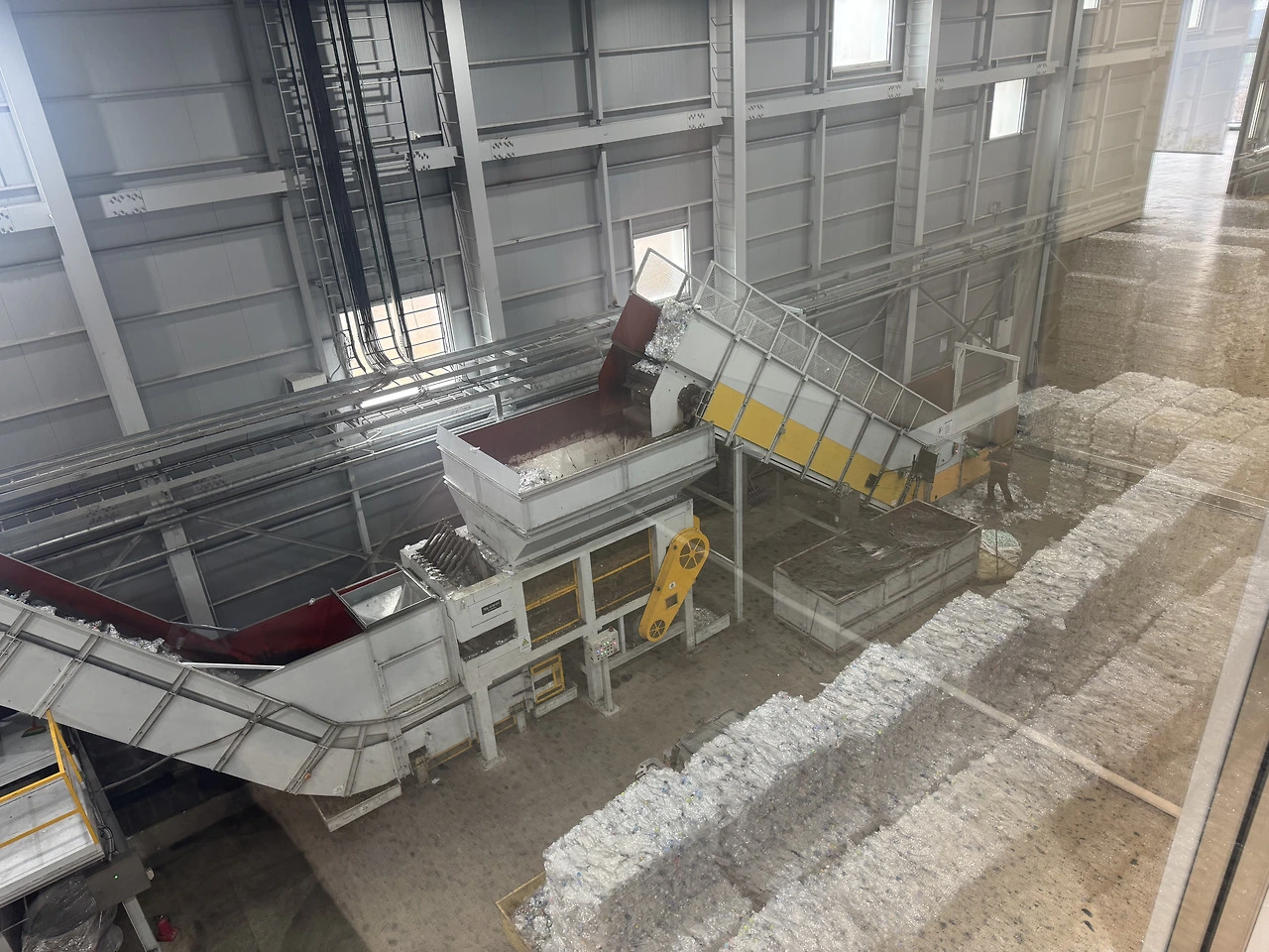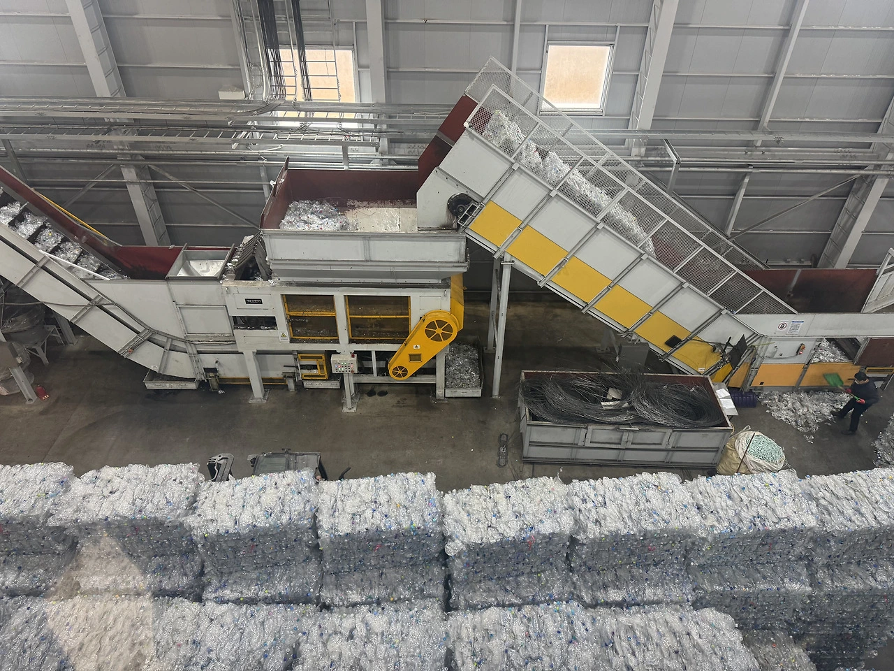 페트(PET)를 순도 높은 플레이크로 가공하는 재활용 공장.