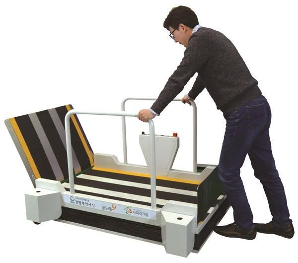 "작년 1월 31일자로 대통령 시행령이 하나 내려왔어요. 2020년 1월까지 국가기관, 공공기관, 학교 등의 강당, 공연장, 집회장에 설치된 무대에는 경사로 및 휠체어리프트를 의무적으로 설치하라는. 보통 무대나 단상은 계단으로 되어 있잖아요. 그러다 보니 휠체어를 사용하시는 분들이 너무 힘들어요. 그래서 무대에 대한 접근성을 확보하기 위해 법을 신설했고, 저희 기업은 이를 위해 '이동식 무대용 휠체어리프트'를 만들었습니다."