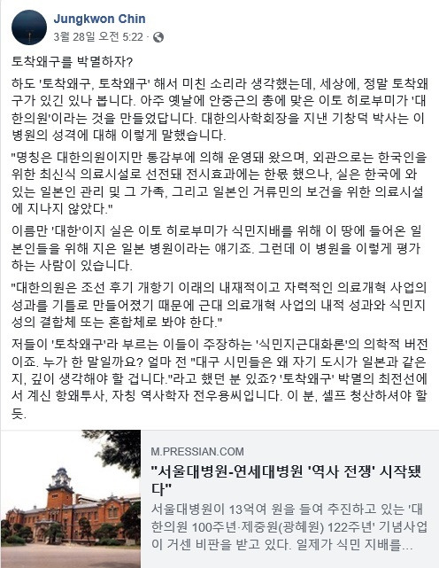 "저들이 '토착왜구'라 부르는 이들이 주장하는 '식민지근대화론'의 의학적 버전이죠. 누가 한 말일까요? '얼마 전 대구 시민들은 왜 자기 도시가 일본과 같은지, 깊이 생각해야 할 겁니다'라고 했던 분 있죠? '토착왜구' 박멸의 최전선에 서 계신 항왜투사, 자칭 역사학자 전우용씨입니다. 이분, 셀프 청산하셔야 할 듯."