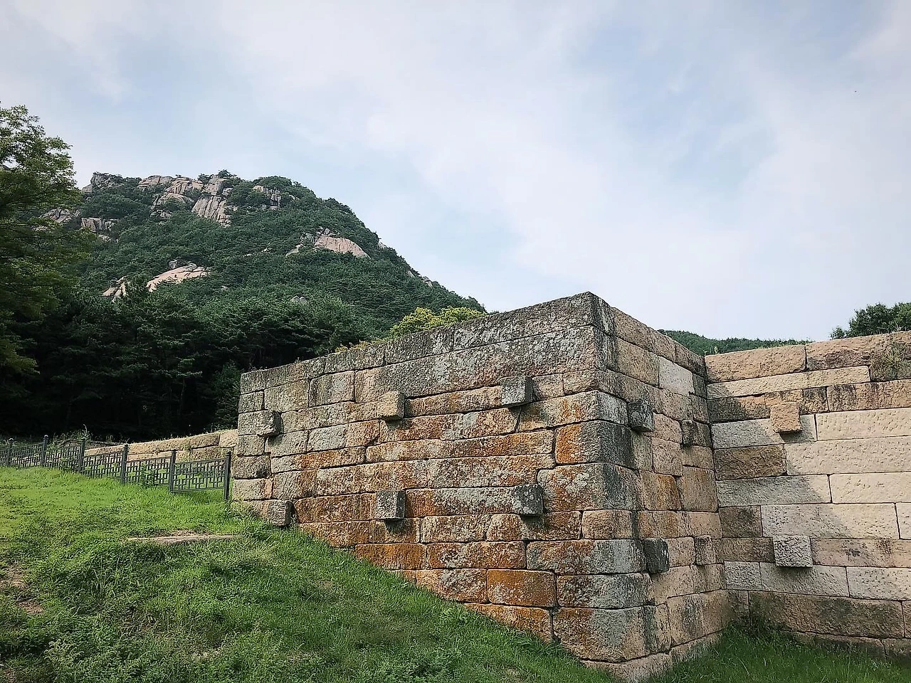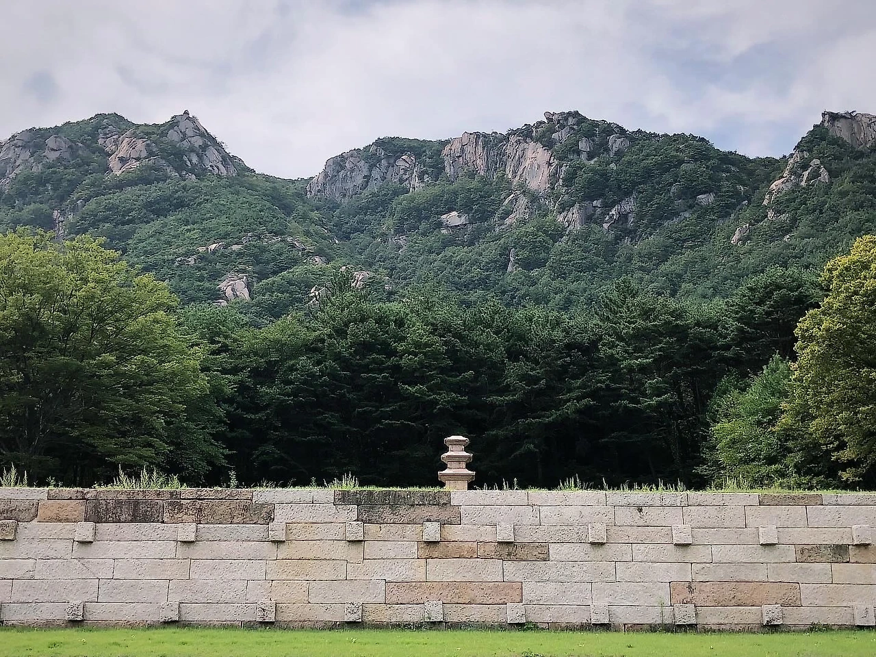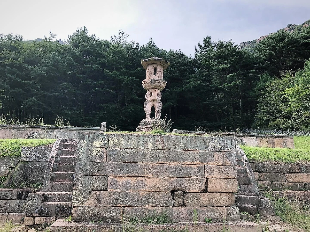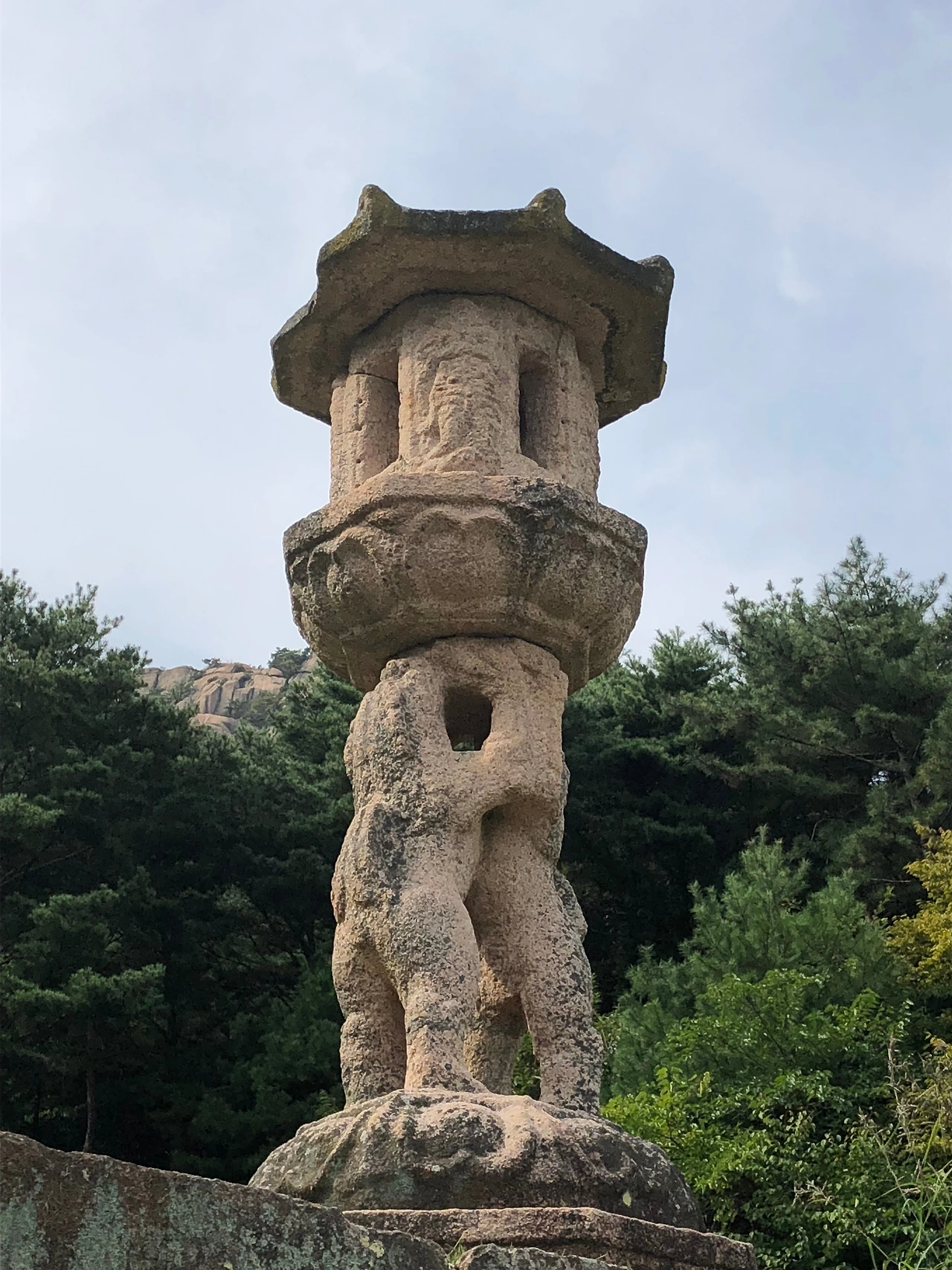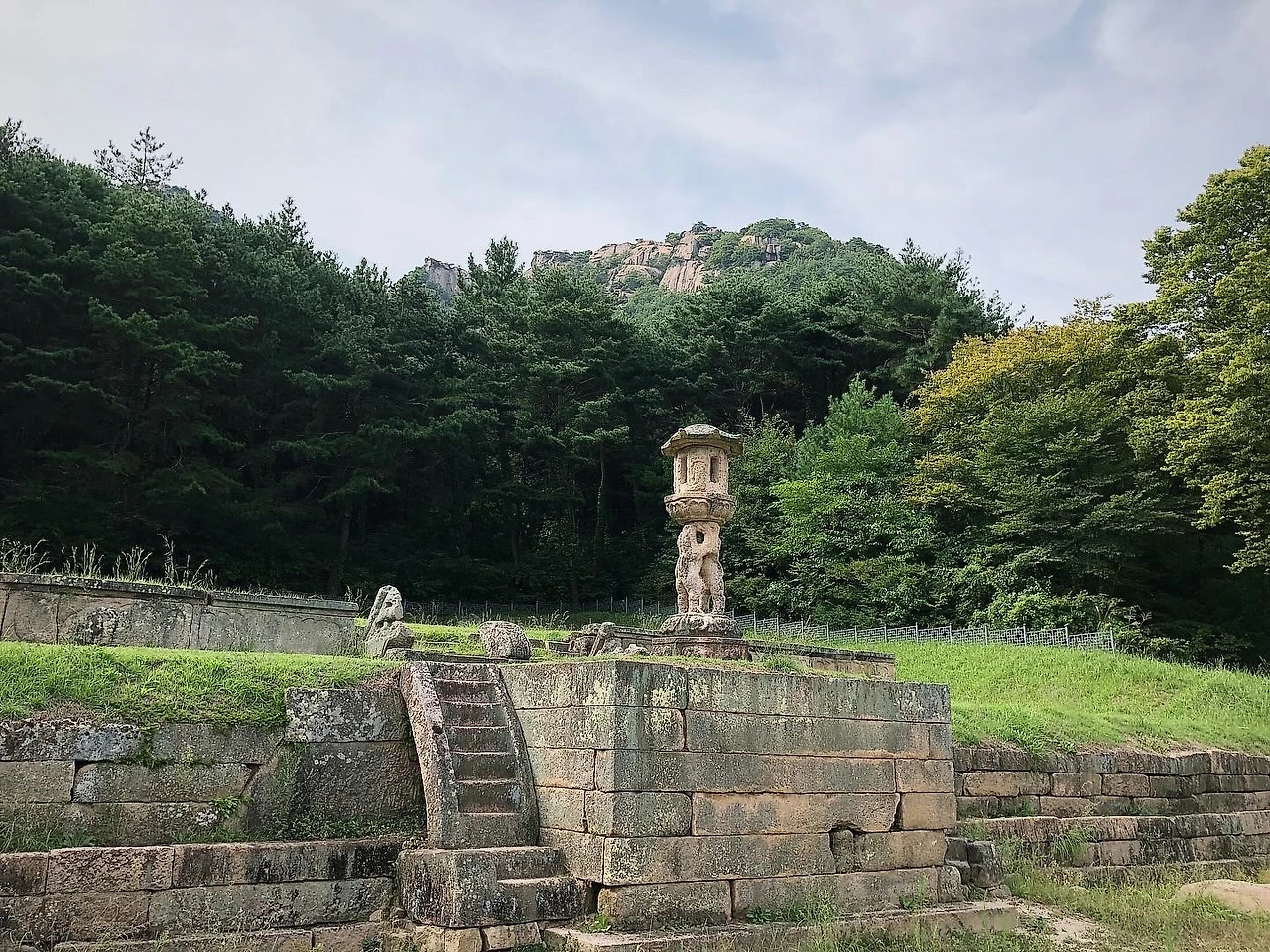 웅장한 화강암 절벽을 배경으로 통일신라 쌍사자 석등이 돋보이는,