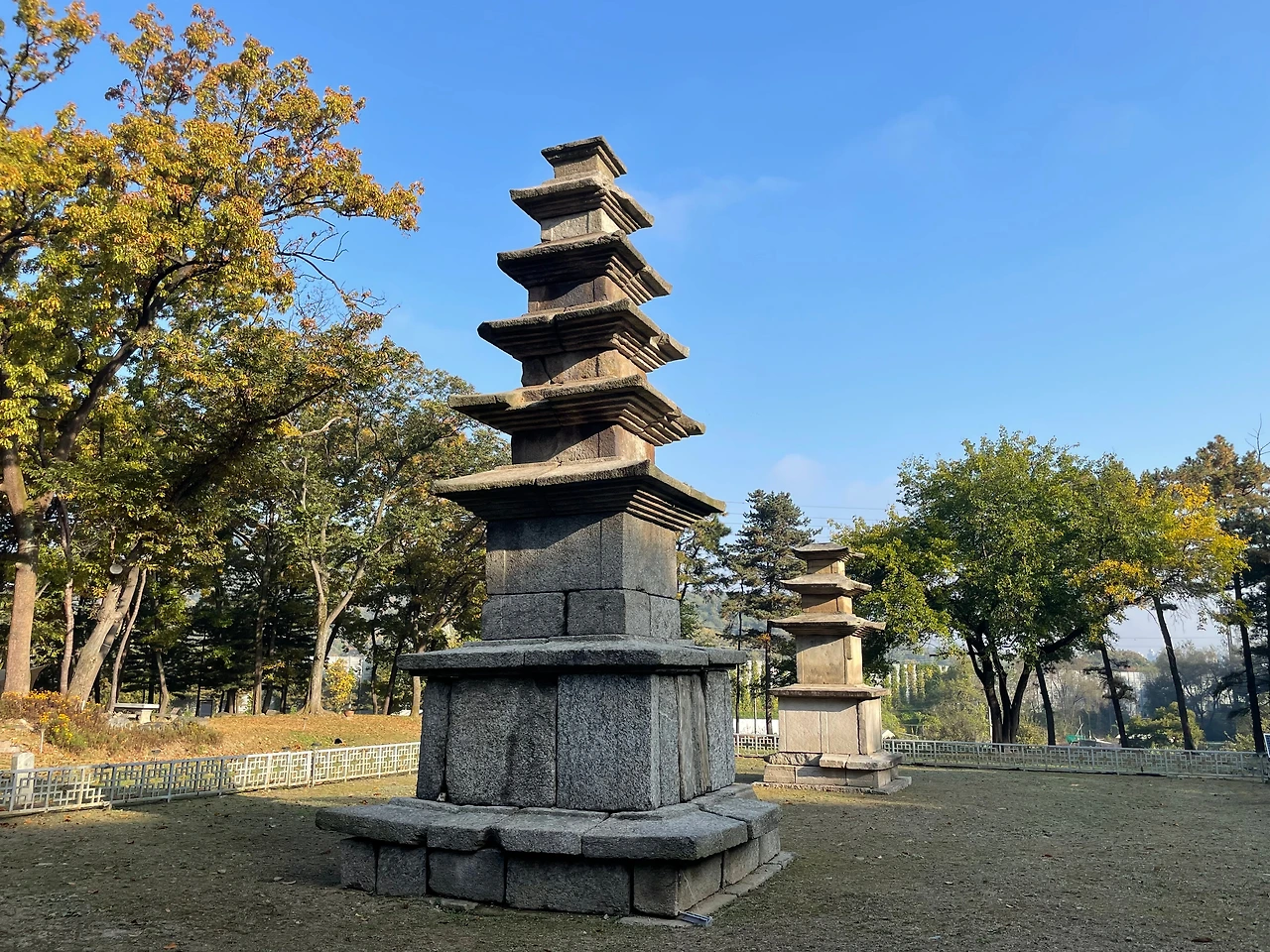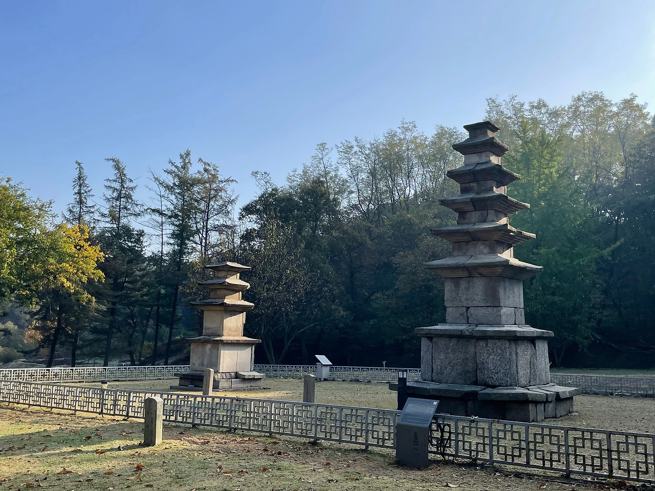오층석탑과 삼층석탑이 나란히 서 있는,