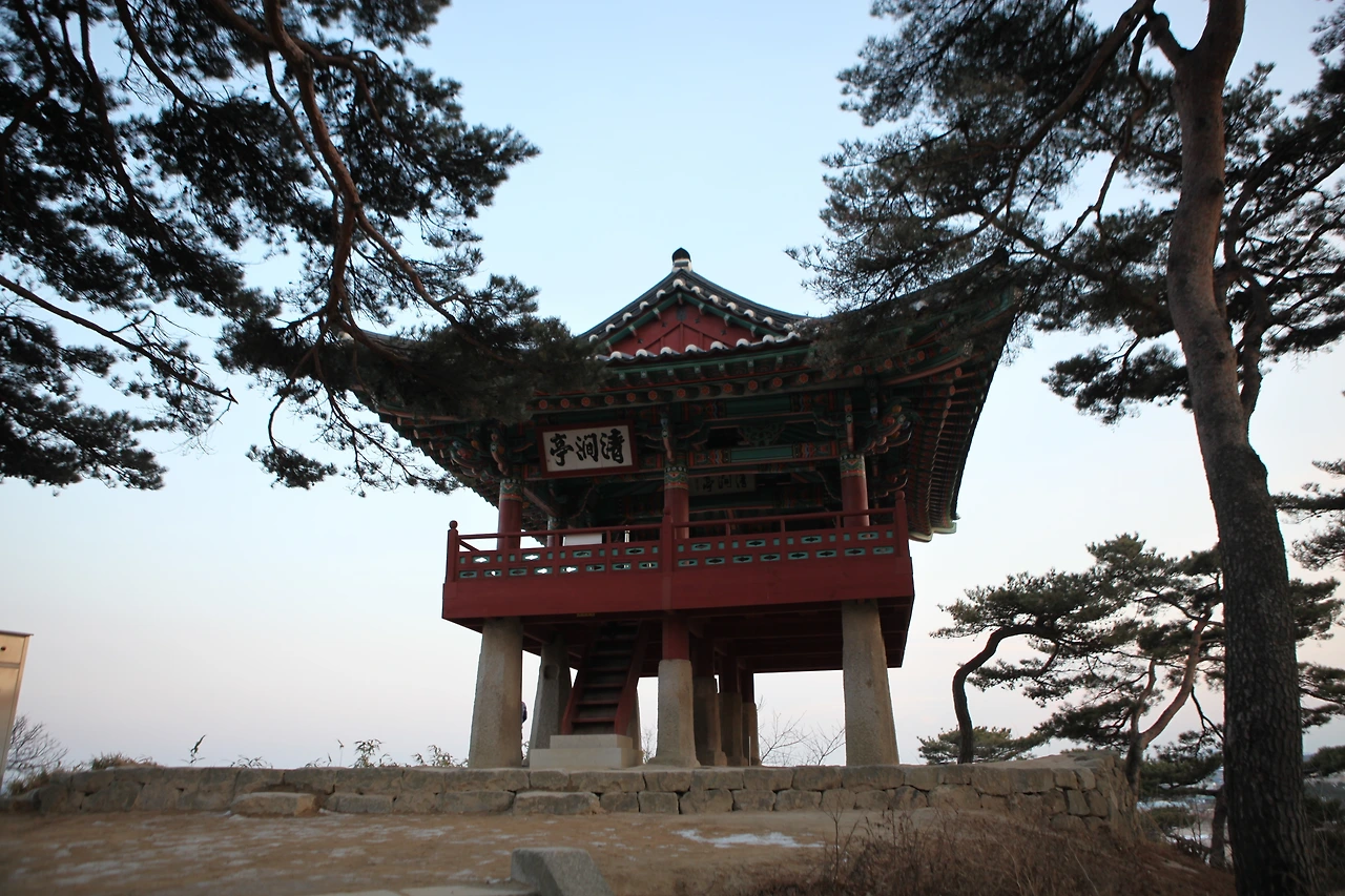 기암절벽 위에 팔작지붕의 중층누정으로 아담하게 세워져 있는,