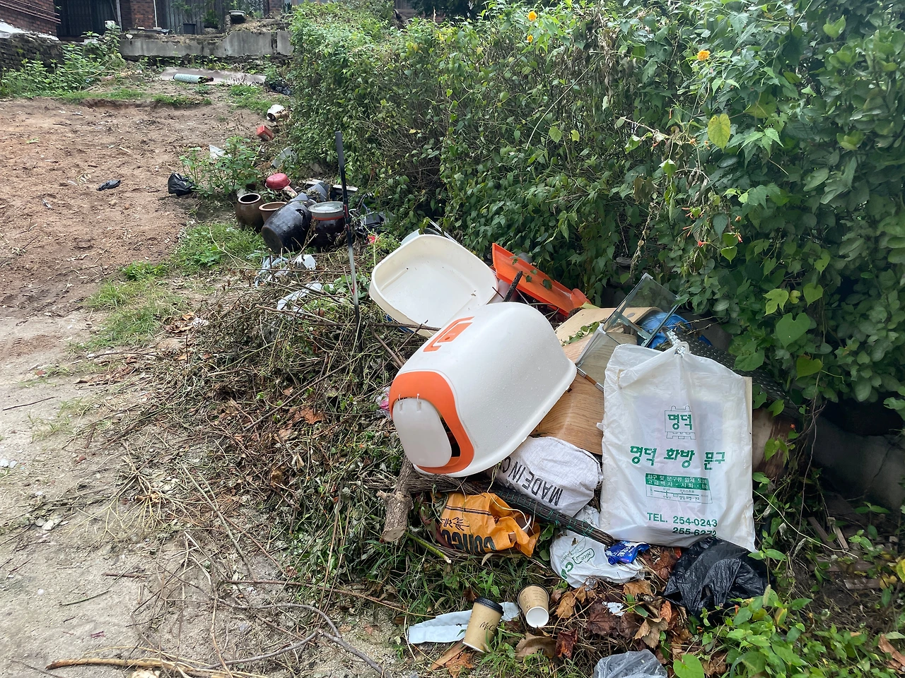 뿐만 아니라 잡풀들과 주변에서 버린 온갖 쓰레기들로 인해 땅의 경계조차 알아보기 힘든 상태였다.