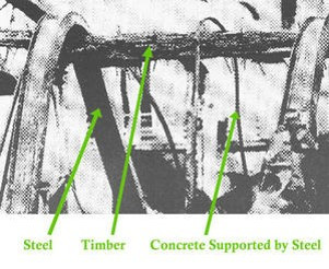 사진 2는 실제 화재 현장에서 스틸(Steel)과 목재(Timber) 그리고 철근콘크리트가 불에 어떻게 반응하고 있는지를 한 눈에 보여줍니다. 스틸은 휘어져 있고 철근콘크리트 역시 콘크리트는 철근과 분리되어 철근만 보입니다. 둘다 이 건물에서 구조적인 역할을 수행할 수 없습니다. 그러나 목재는 여전히 스틸과 철근콘크리트의 철근까지 걸친 채 버티고 서 있습니다. 보의 역할을 충분히 수행하고 있음을 볼 수 있습니다.