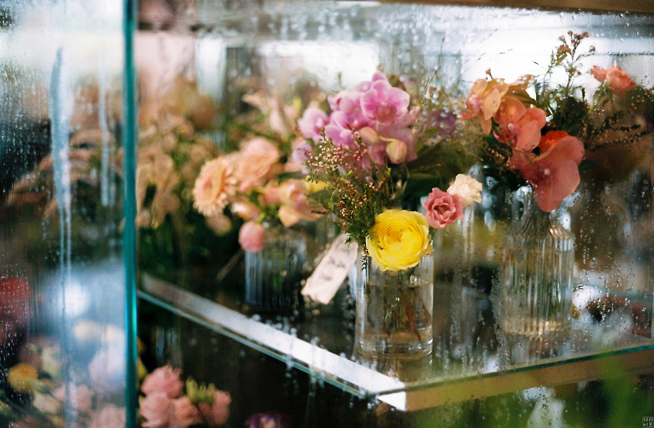 엄청나게 무덥고 습한 날씨에 꽃들이 있는 냉장 공간 외부 유리가 눈물(?)을 흘린다. 이 장면이 묘~하게 비를 맞은 꽃처럼 예쁘다.