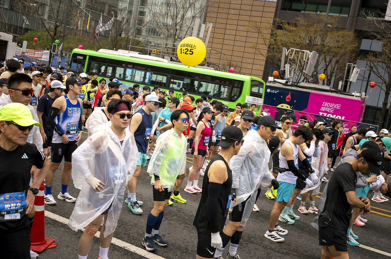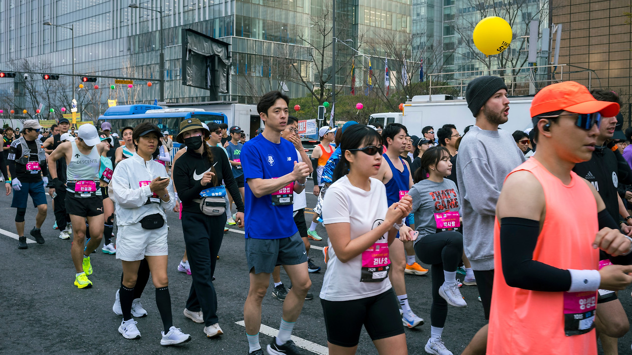 도시에서의 삶이란, 길을 걷다 웃는 사람을 만나기 참 어렵다. 혹시 일행이 있어 대화를 나누다 웃는 경우조차도 흔한 일이 아니다. 그런데, 선두 그룹이 지나간 뒤 사람들 표정에 미소 가득, 웃음 가득이다. 뭐랄까, "찐" 행복 이 느껴진다. 한참 쉬고 싶은 주말 아침 7시 30분에 집에서 나와 광화문에서 힘든 러닝을 앞두고 있는 사람들 표정이 아니다.