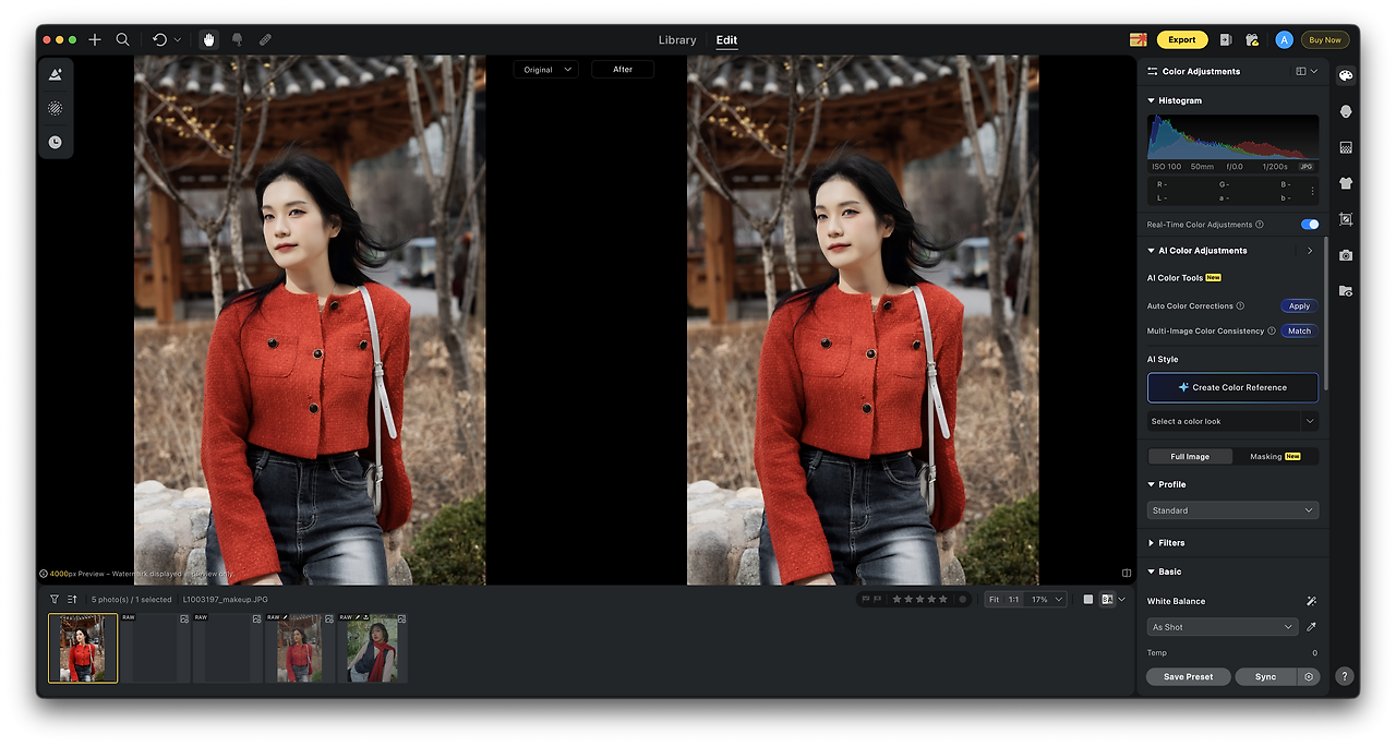이럴 때, 한 장의 사진을 공들여 컬러 작업을 한 뒤, 나머지 사진을 레퍼런스 사진을 기반으로 색을 매칭하면 상당히 편리하다.