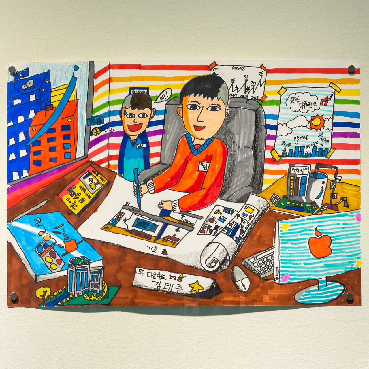 미술학원 앞에 아들이 그린 그림이 전시되었다. 책상에 iMac 이 있다. 여기저기 깨알같이 내가 사용하는 소품을 그린 아들이 신기하다. 그나저나 뒤에 그래프는 내 매출실적인가? 어딘가 닮은 것도 같다. 들쭉날쭉.. 한참을 웃어본다.