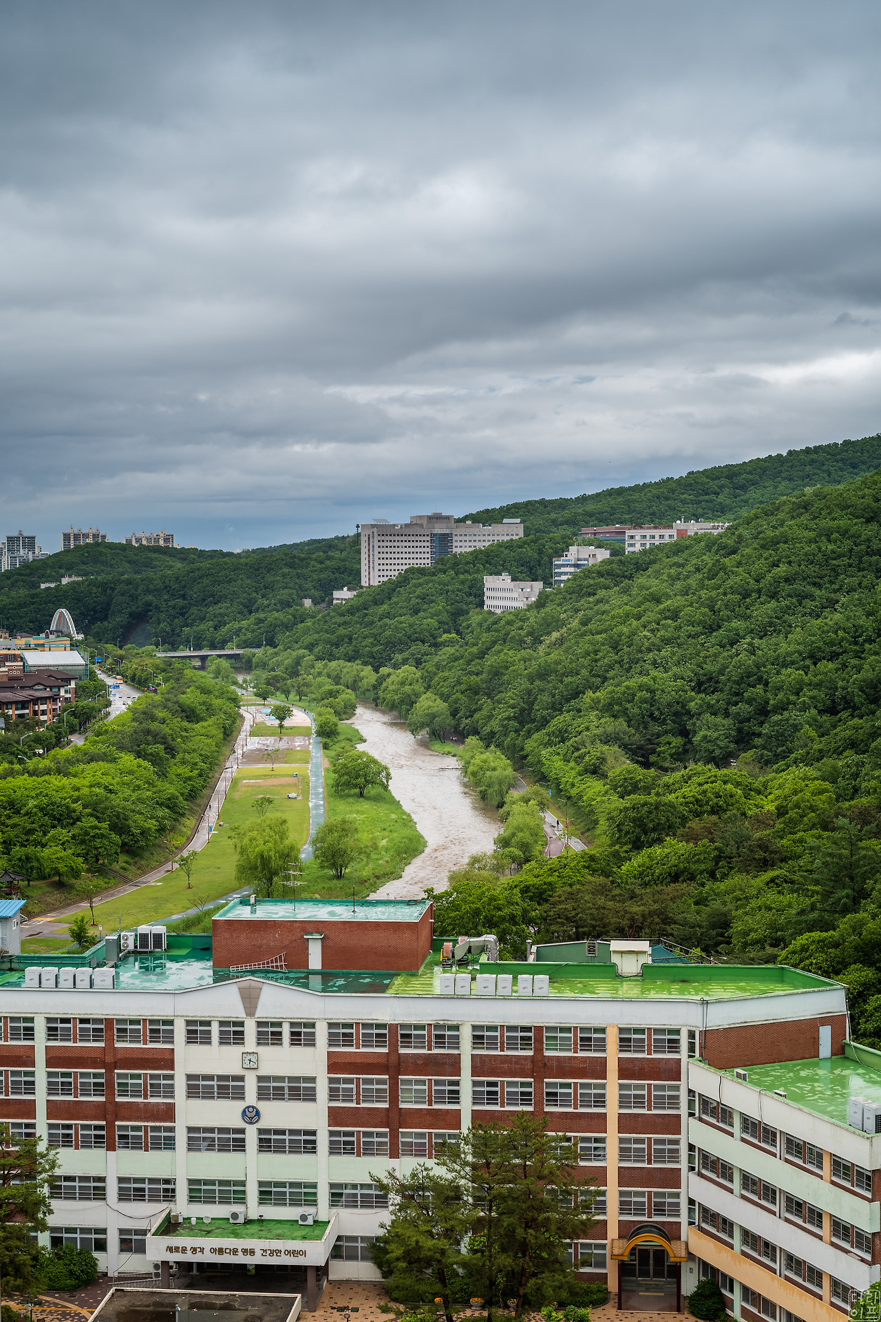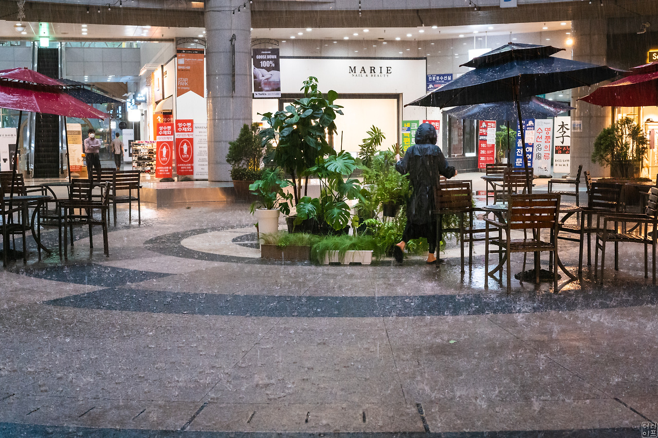 지난 월요일 비가 정말 미친 듯 내리던 날 아들을 Pickup 하러 학원 건물로 왔다. 학원 건물은 실내 가운데 하늘이 Open 되어 있는 구조이다. 실내에서 비가 미친 듯이 내리는 구경을 하니 참 볼만(?) 하다.