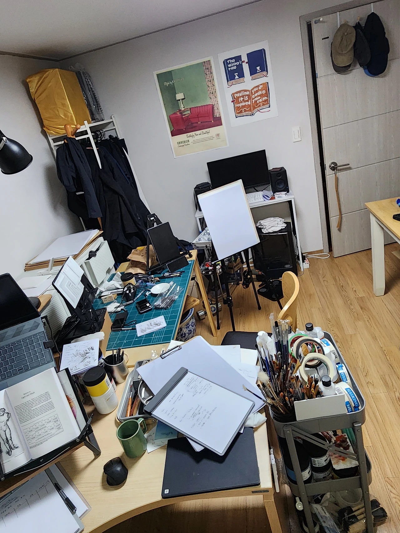 문화예술 지원금을 받는 것도 아니고 대학이나 어디 기금에서 장학금 받는 것도 없다. 작년에 혹시 뭐 좀 타먹을 수 있을랑가 싶어서 예술인 등록 신청을 정성들여 해봤는데 서류가 미비하다고 빠꾸를 먹었고 나는 거기서 삔또가 나갔다. 꼬라지가 나버렸다. 내 다시 어디 뭐 신청하나 봐라. 내가 니 아니면 뭐 없는 주 아나.(사실 없다) 아무튼 엑셀로 표 만들어 숫자 서식 천단위 콤마 맞춰놓고 화방 쇼핑몰별 가격 비교체크하여 최저가를 맞춘다. 5만원 이상 무료 배송, 할부 5개월. 이렇게 내 시간, 내 돈 들여 물감 사고 종이 사는데 남의 말이 귀에 들어 올까? 온 오프라인 모두 쭈구리로 살테니 조막만한 방안의 싸구려 종이 위에서만큼은 나도 텃세 좀 부려보자.