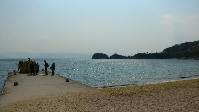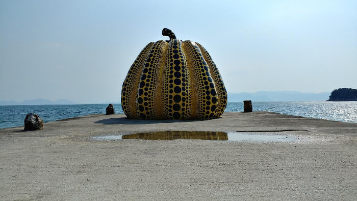 지중미술관 등을 구경하고 돌아나오면 바닷가 방파제 끝에 야오이 쿠사마의 노란색 호박이 육중한 자태를 뽐내고 있습니다. 태풍에 휩쓸려 가서 분실된 것을 다시 찾게 되어 더 유명해졌다고 합니다. 저 무거운 쇠덩어리가 떠내려 갈 정도라면 태풍의 위력이 어느 정도였을지 가늠이 되질 않습니다.