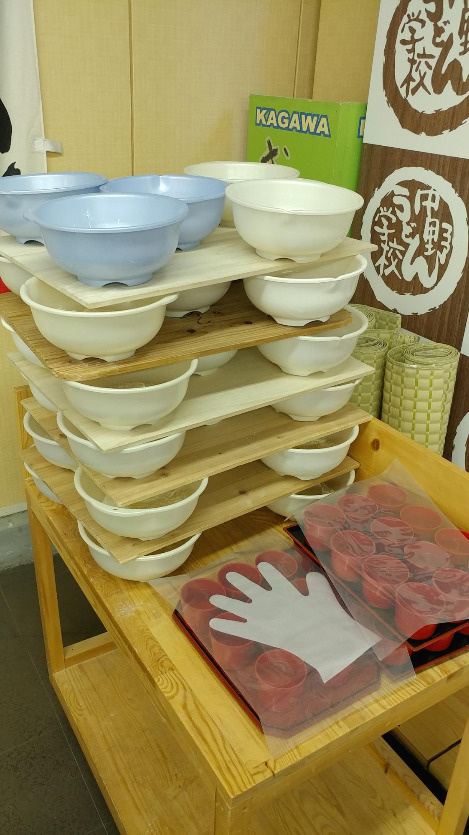 우동학교는 시간대별로 운영되기 때문에 여러개의 방으로 나뉘어져 있습니다. 각 방마다 우동면을 뽑기 위해 미리 반죽을 해서 숙성시켜 둔 재료들과 개인 도구들이 가지런히 정리되어 있습니다.