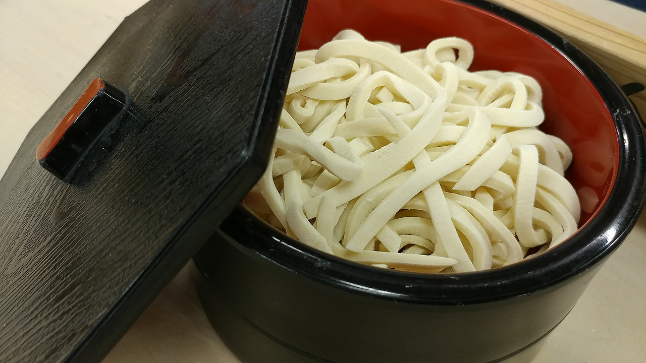 썰어 낸 면을 봉에 걸어서 툭툭 털어주면 면이 완성됩니다. 준비된 용기에 담아서 우동을 조리하는 곳으로 가져가서 끓이는 것만 남았습니다.