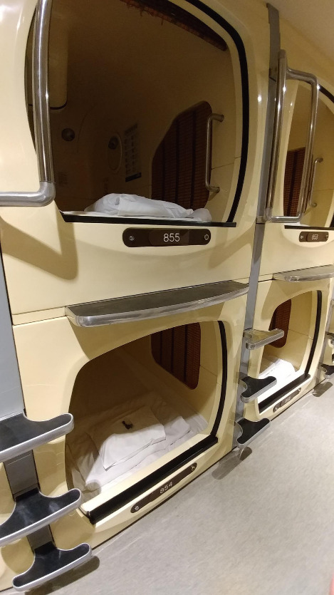 캡슐호텔의 객실은 말 그대로 캡슐 한칸입니다. 가로세로 90센치미터와 길이 2미터의 캡슐이 제게 주어진 객실 한칸이 되는 것입니다. 그리고 이런 캡슐들이 2층으로 켜켜이 쌓여 있습니다.
