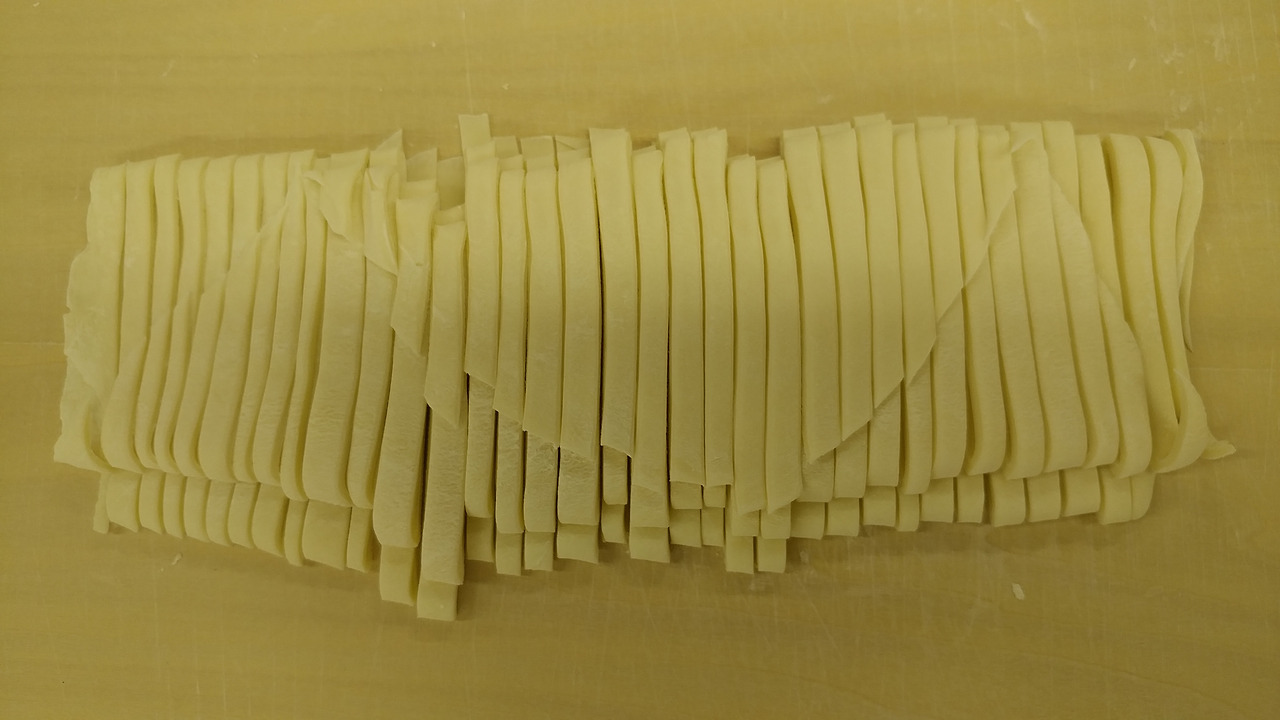 이렇게 고르게 편 반죽을 3밀리미터 간격으로 썰어내면 가장 적절한 굵기의 우동면이 완성됩니다.