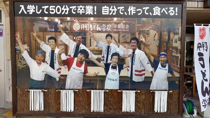 입학후 50분이면 졸업할 수 있는, 자기 스스로 만들어서 먹는 논스톱 코스, 이것이 나가노 우동학교를 들어서면 처음 학생(?)들을 맞이하는 문구입니다.