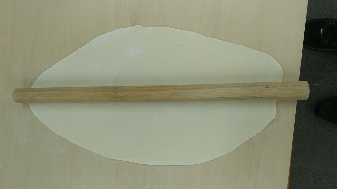 제공되는 우동 반죽은 한 덩어리가 1인분 분량입니다. 미리 준비된 봉으로 반죽을 천천히 밀어서 펴주는데, 반죽이 봉의 길이만큼 펴지면 가장 적절한 두께가 된다고 합니다.