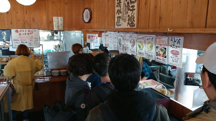 우동버스의 첫번째 토스는 나가노 우동학교를 마주보고 있는 우동가게 <靑水屋>입니다. 입구로 들어서면 우동면을 뽑는 모습을 그대로 볼 수 있습니다. 우동의 종류를 고르고 입맛에 맞춰 토핑을 고르면 주문이 끝납니다.