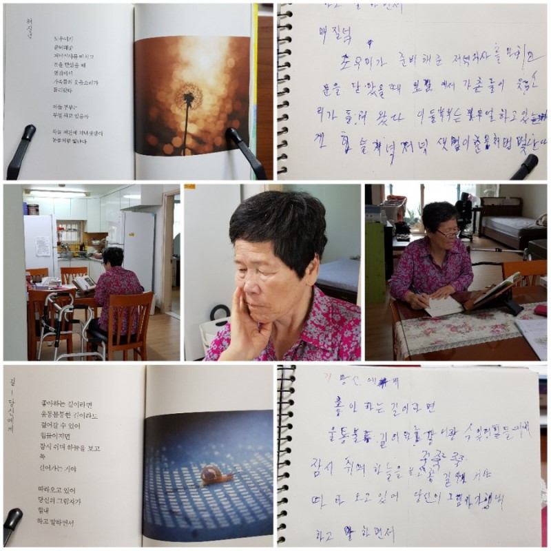 데이케어 안 가는 주말엔 나와 종일 집에서 지낸다. 밥 먹고 시간이 나면 시집을 베껴 쓴다. 오래 있지는 못하고 한 두세 편씩 써보게 한다. 다 쓰면 나에게 읽어보라고 내민다. 원문 없이 그대로 말이 되면 박수를 쳐드린다. 어떤 문장은 도저히 무슨 말인지 짐작이 안 되어 시집과 맞춰보면 엄마는 실망하는 기색이다. 내가 시를 먼저 외워놓아야 할까 보다. 어려운 엄마 글씨도 척척 읽어내서 기쁨을 드리고 싶기 때문이다. 내가 초등학교에 들어가서 한글을 처음 배웠을 때 엄마는 큰소리로 책을 읽는 나를 대견해했다. 이제 나도 엄마가 베껴 쓴 시를 읽으며 엄마를 대견해한다. 포기하지 않고 열심히 하는 노인 학생 한 명 행복하게 만들어 주고 싶다. 그래서 시인 할머니처럼 이 순간이 가장 행복하다고 생각하면 얼마나 좋을까?