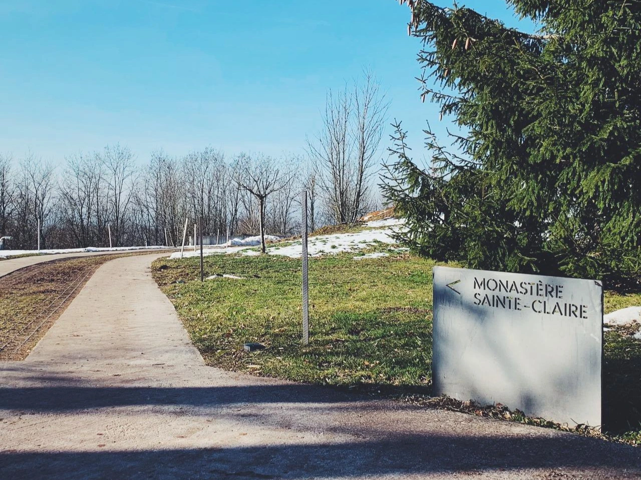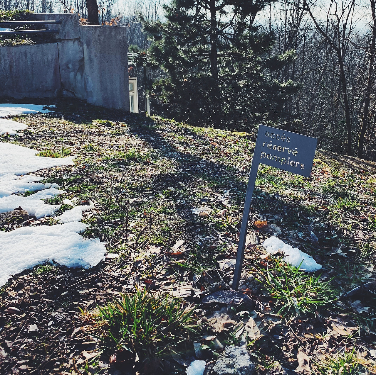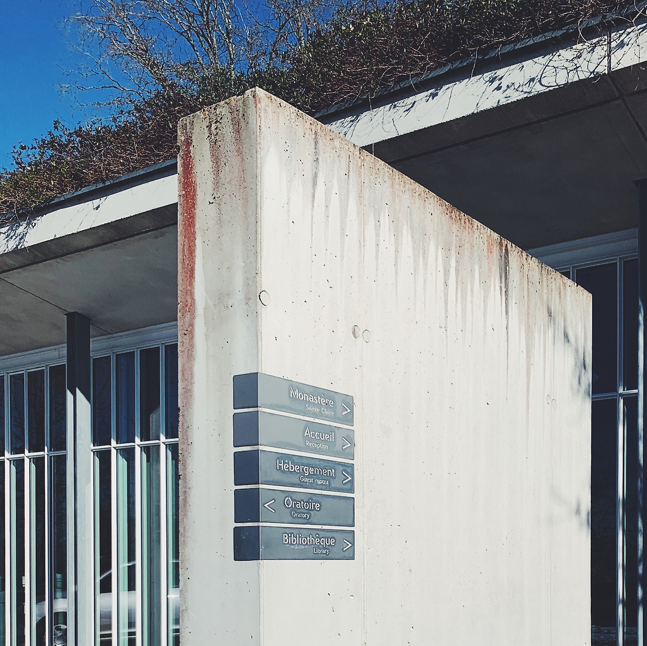 마침내 입구에 다다라, 노란색 입간판을 만났다. Porterie / Entrance라는 글자와 방향표시가 뚫려있었다. 이거 웹사이트에 쓰였던 서체! 건축물의 사인에서 온 거였구나. 입구뿐만 아니라 새로 지어진 건물의 모든 사인이 같은 재료와 같은 공법과 같은 폰트를 쓰고 있었다.(사인이 설치된 진입로를 포함하여 성당 입구의 게이트하우스 La porterie와 성당 근처의 성 클라라 수녀회의 수도원 Monastère Sainte-Claire은 렌조 피아노가 설계하여 2011년에 준공된 공간이다. 그래픽과 사인은 M.Harlé 의 컨설팅을 받았다고 소개되어 있다.)