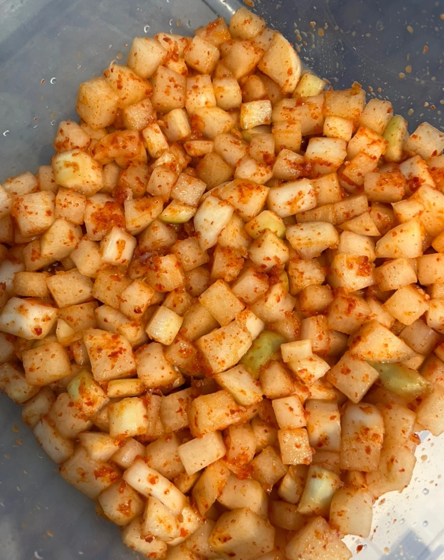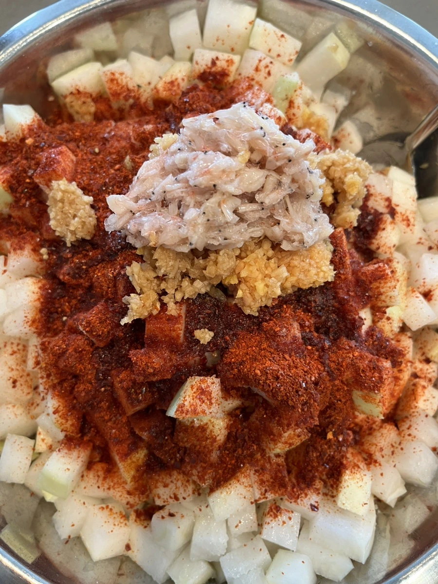 소금, 설탕, 고춧가루, 다진 마늘, 멸치 액젓, 생강가루, 매실청, 새우젓, 뉴슈가(쬐금) 을 넣고 버무린다.