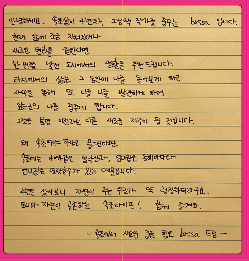 인터뷰 내용은 비교적 간단했다. 속초살이를 시작할 때 필요한 마인드라던가 어떤 성향의 사람이 어울리는지, 이곳에서의 즐거움과 어려움은 무엇인지 등등 마지막으로 하고 싶은 말은 간단하게 손 편지로 남겨달라 해서 오른쪽처럼 적었다.