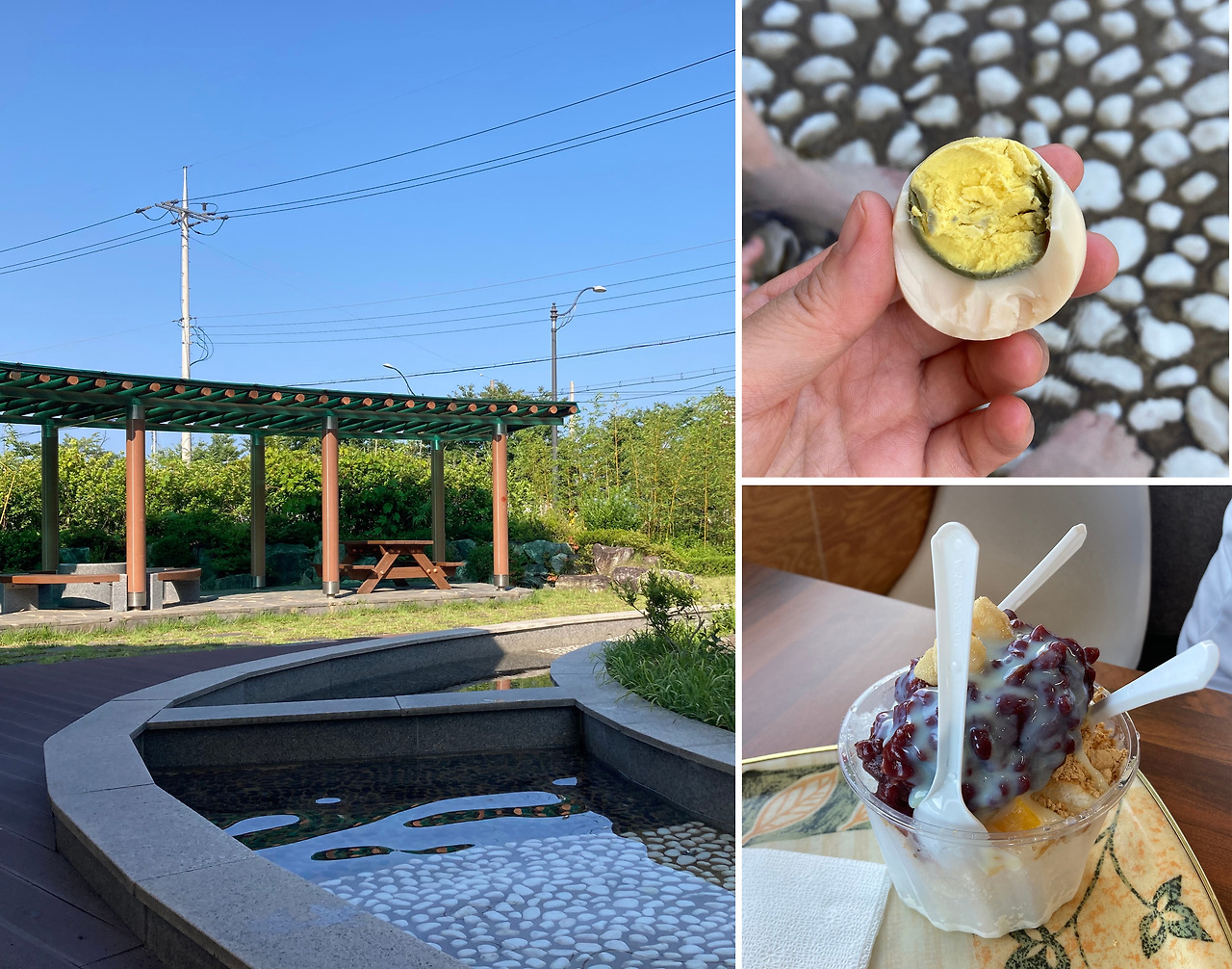 그저 하루종일 가장 낮은 위치에서 분주한 몸을 따라 여기저기 움직이는 탓에 제대로 힘들다는 내색도 못하고 팅팅 부어만 있던 발은 따뜻한 물을 만나 잠시나마 쉼을 얻는다. 족욕탕 바닥에는 뭉글뭉글한 돌이 깔려있어 그 위를 살살 걸으면 지압효과도 얻을 수 있다. 땀으로 허기진 배는 온천수로 삶은 달걀로 가볍게 채워주면 이것이 또 그렇게 맛있다. 평소 퍽퍽하다면 노른자를 먹지 않던 아이도 이곳에 오면 병아리처럼 잘도 받아먹는다.