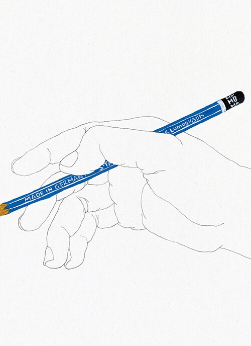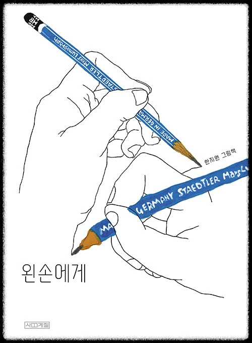 << 왼손에게 >> 그림책 작가 한지원은 이 작품에서 '손'을 표현하기 위해 다양한 스타일들을 실험했다. 가장 사실적이고 자연스러운 손동작을 구현하기 위해 많은 손을 그리며 손의 주름과 악력 등을 표현하며 비슷한 동작으로 가기 다른 손의 감정들을 전달한다.